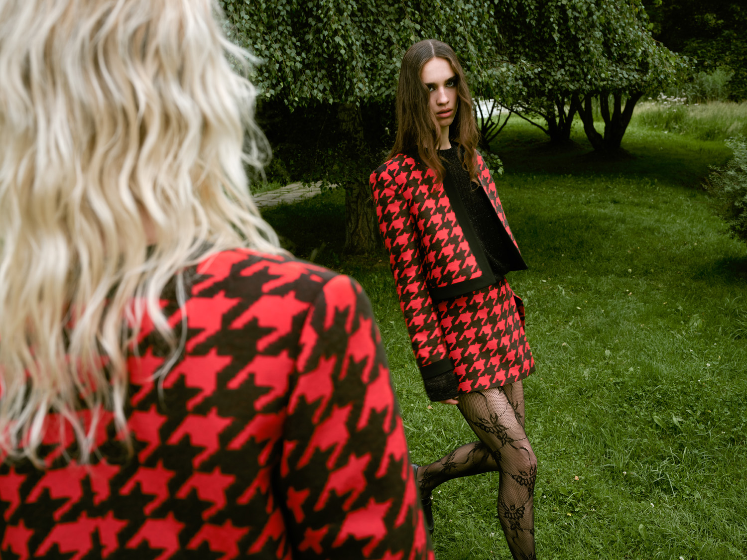 Ключевыми моделями заявлены костюмы с юбкой и укороченным блейзером в черно-белом и красно-белом принтах «гусиная лапка»: такие когда-то удавались на славу разве что Balmain. Пиджак-мундир в викторианском стиле с контрастной каймой и золотыми пуговицами LIMÉ предлагает носить на голое тело, сочетая с костюмными брюками палаццо: смело, но кто не рискует, тот не срывает овации. Вариант чуть скромнее — шелковая полуприлегающая рубашка с прозрачными рукавами и спиной, отлично ладящая с брюками клеш из экокожи.