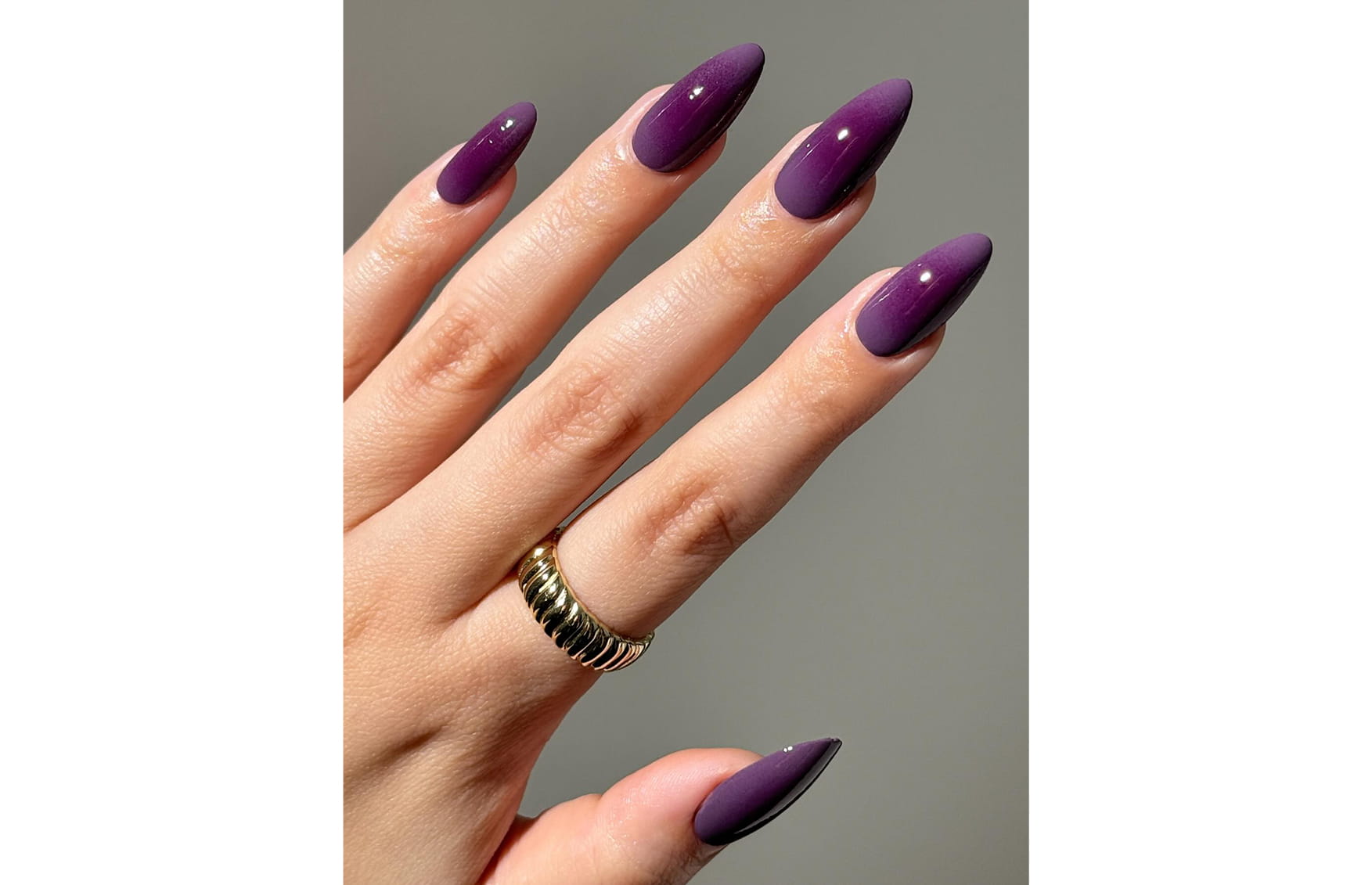 Аметист в 2026 году — не магический фиолетовый, а сложный, приглушенный оттенок с серыми и графитовыми нюансами. Он создает эффект дымки и глубины. Цвет раскрывается по-разному при разном освещении и добавляет маникюру визуальный объем.