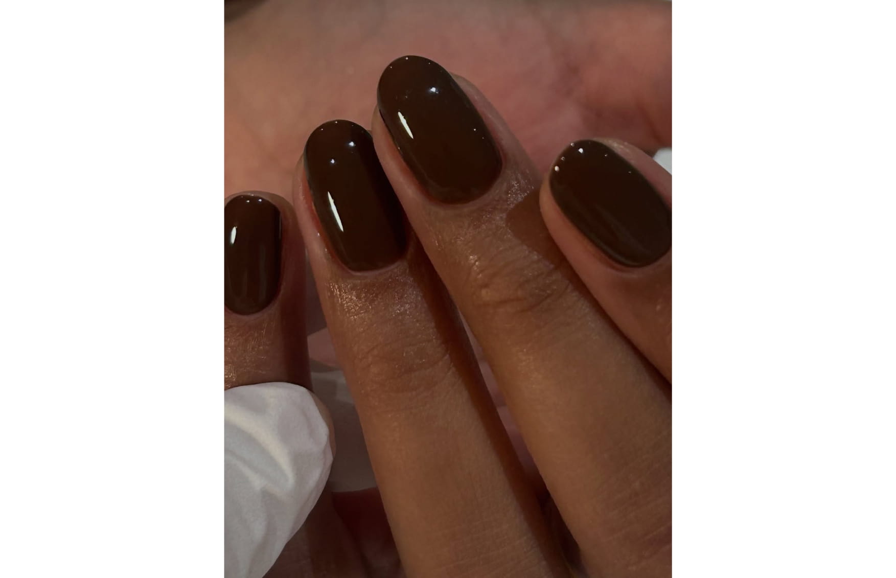 Глубокий шоколадный цвет становится альтернативой черному. Он выглядит мягче, теплее и заметно дороже. Особенно эффектно смотрится в глянцевом покрытии без дизайна, делая акцент на форме и длине ногтей.