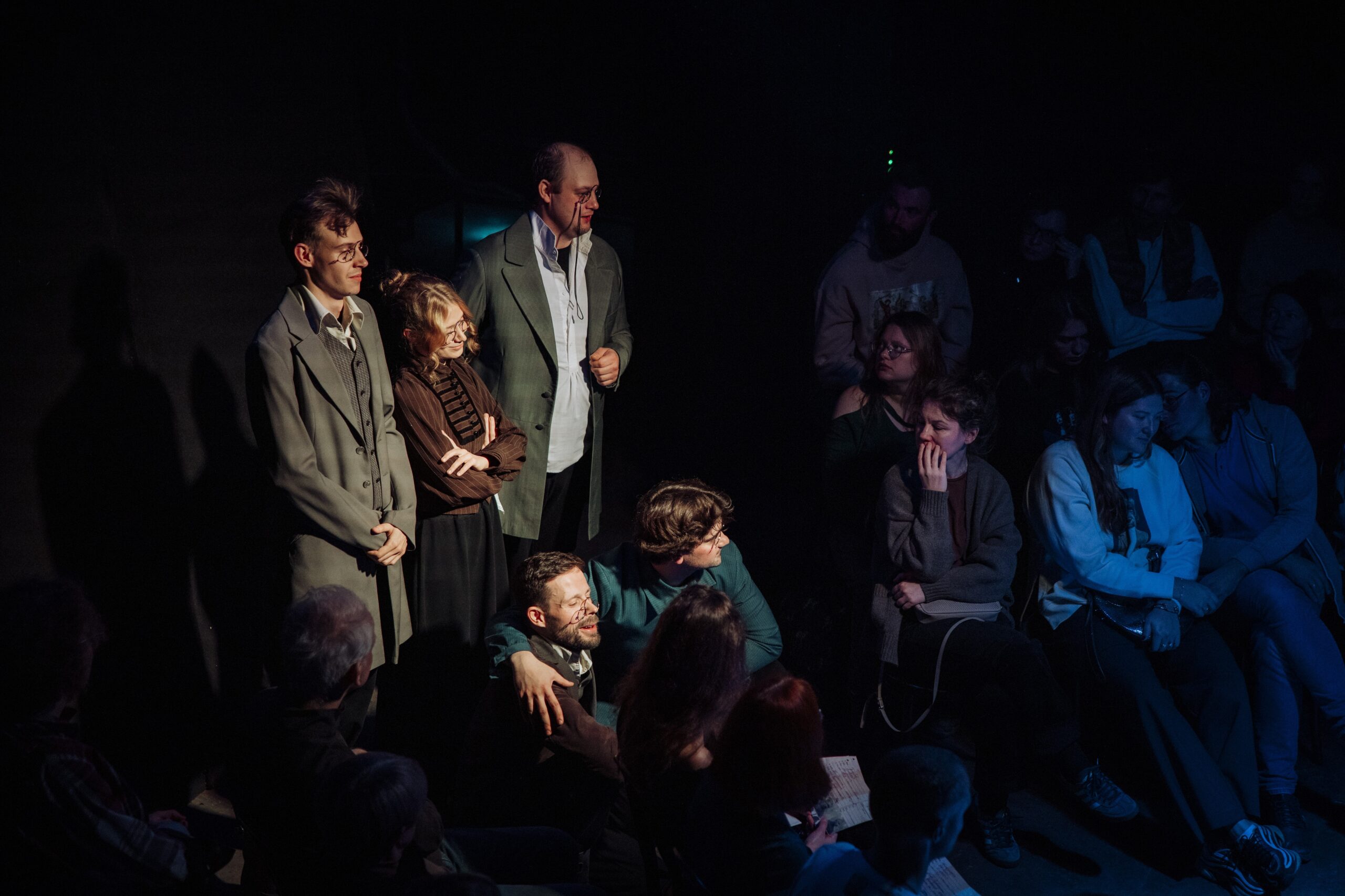 Спектакль устроен предельно просто. На сцене почти нет декораций. Несколько актеров — Андрей Лаптев, Илья Барабошкин, Алексей Гладков, Дарья Затеева и другие — свободно ходят вокруг зрителей, переодеваются по ходу действия, выносят реквизит. Из-за этого граница между залом и сценой почти исчезает, и возникает ощущение, что ты находишься внутри происходящего.