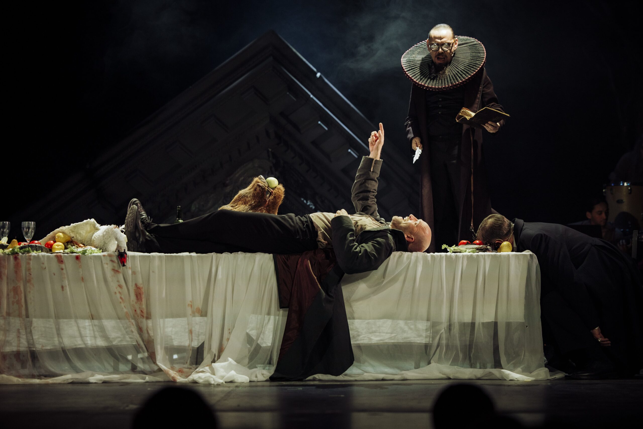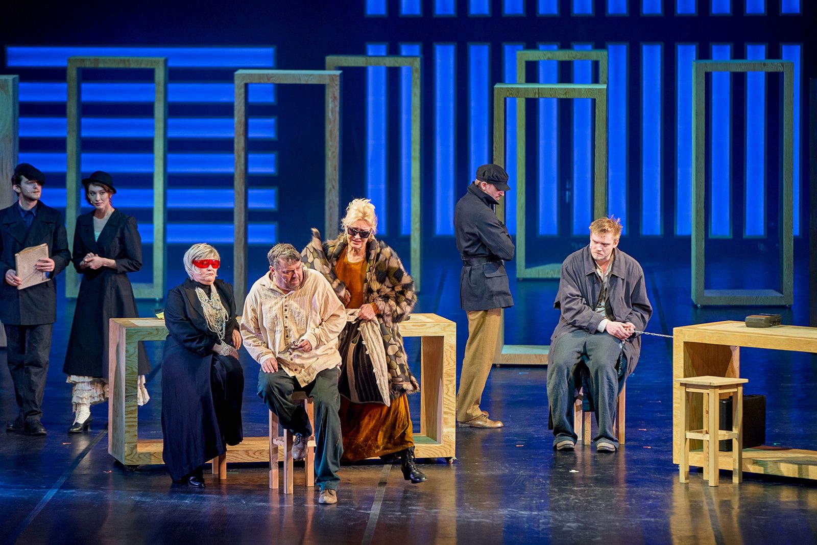 Еще одна важная постановка фестиваля — «Преступление и наказание». В авторской версии тоже нет привычного пересказа романа. История превращается в следственный эксперимент над Раскольниковым, который словно оказывается внутри собственного сна. Пространство вокруг выглядит искаженным, люди — тревожными отражениями его состояния. Реальность распадается, память вытесняет произошедшее, и зритель наблюдает не столько ход следствия, сколько внутреннее движение героя.