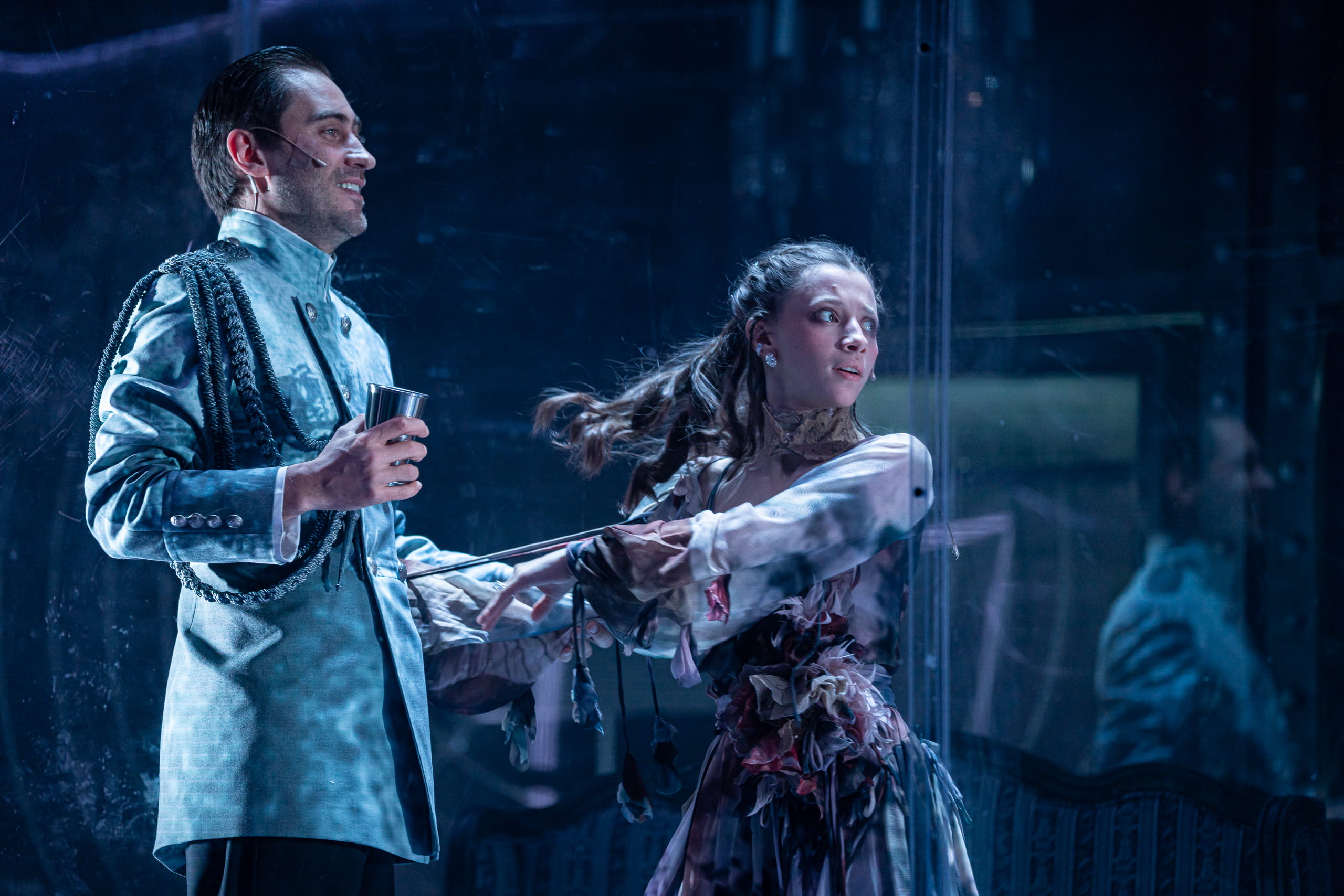 Текст романа Чащиным значительно сокращен, но от этого нисколько не ускользает центральная тема сюжета. И антураж здесь правит бал: чертовски оригинальная затея состоит в том, что под металлически-голубым светом по всей длине сцены растянут стеклянный поезд. Он никуда не едет и так и остается на месте до финала.