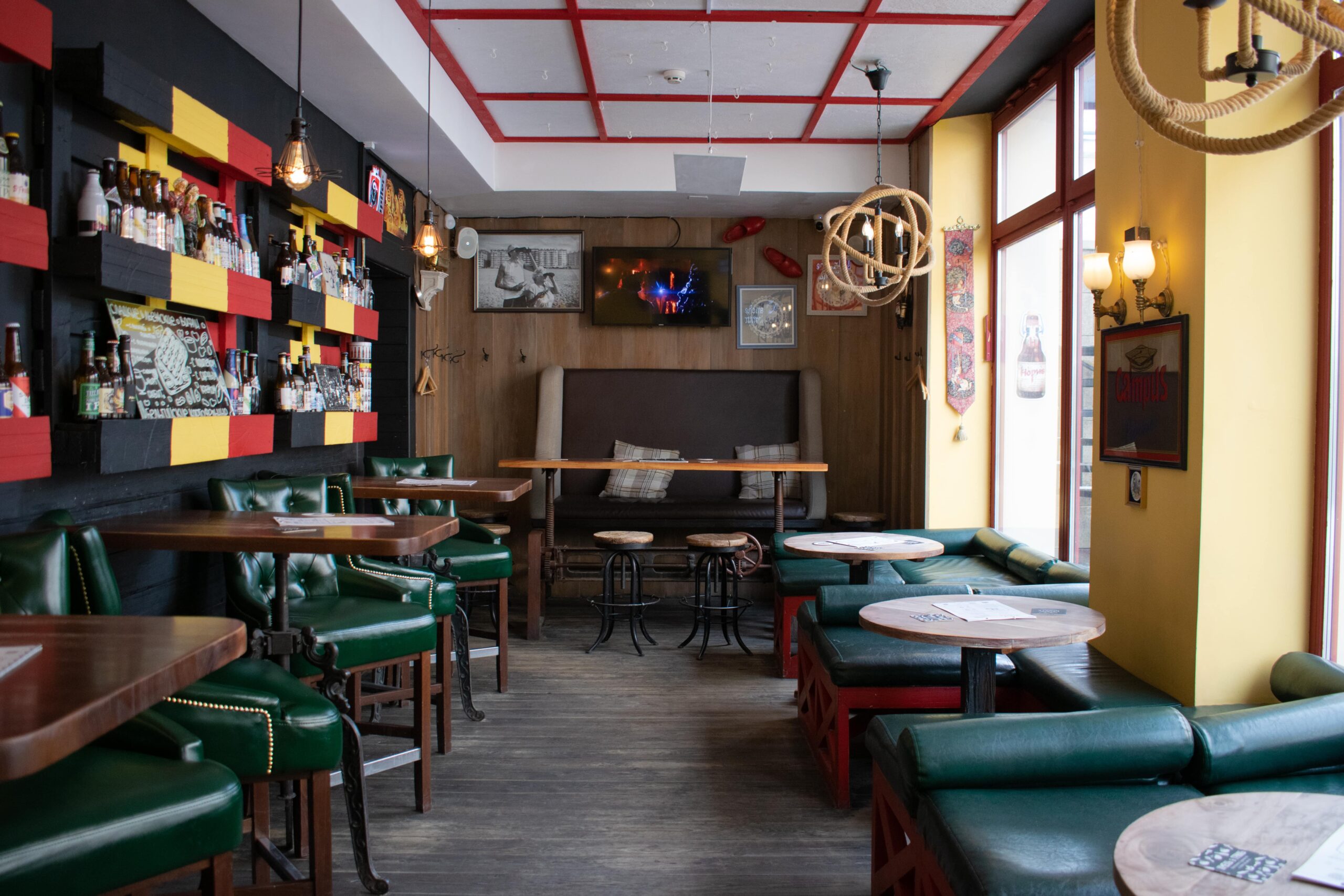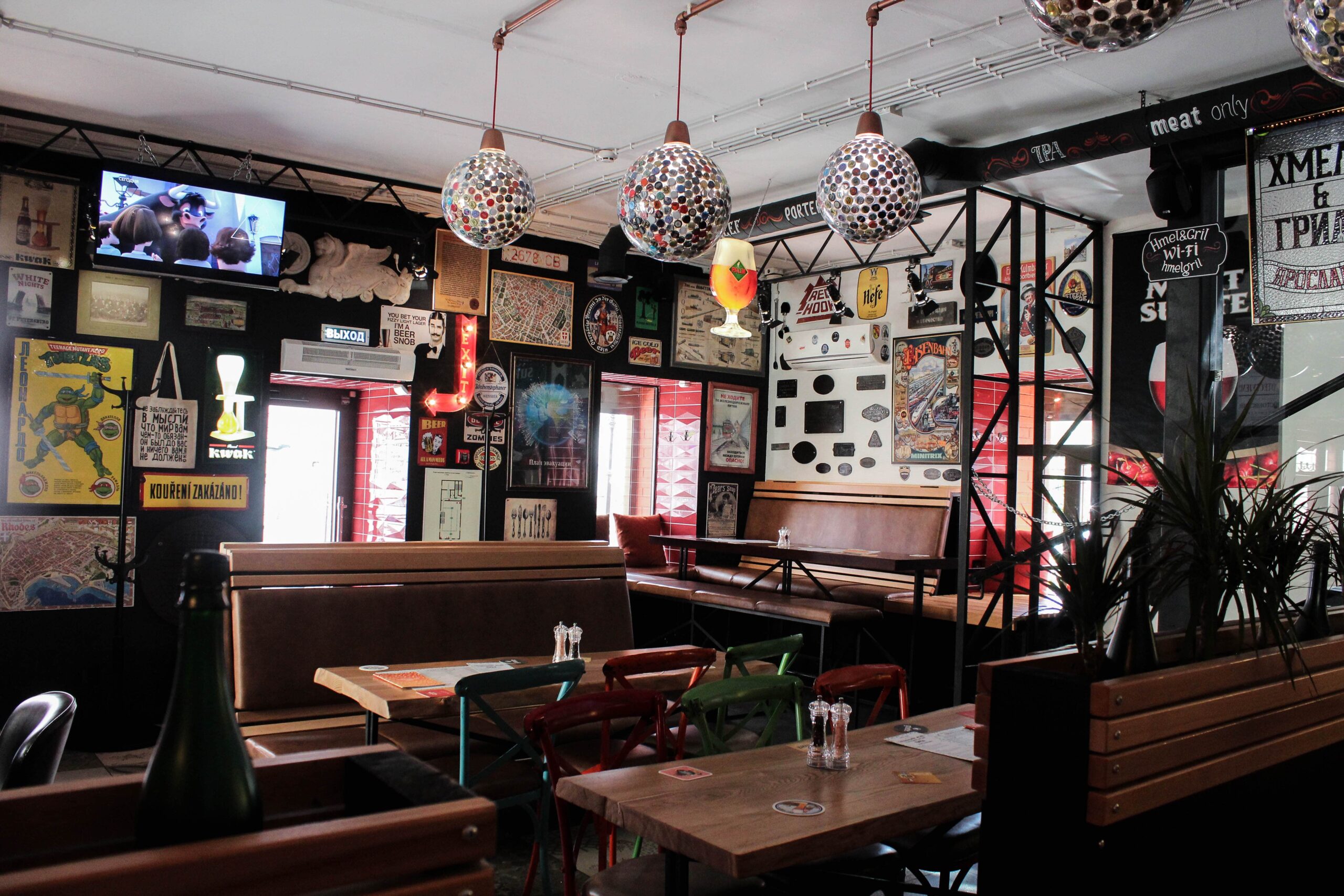 Это мясной ресторан с хоспером, 30 кранами разливного пива со всего мира и коллекцией артефактов. Интерьер напоминает брутальный лофт с отсылками к американским стейк-хаусам: дерево, металл, трубы под потолком, флаги, логотипы пивоварен. Из интересных деталей: барельеф с Волковского театра, часть вывески планетария, коллекция страховых досок и пивная атрибутика.