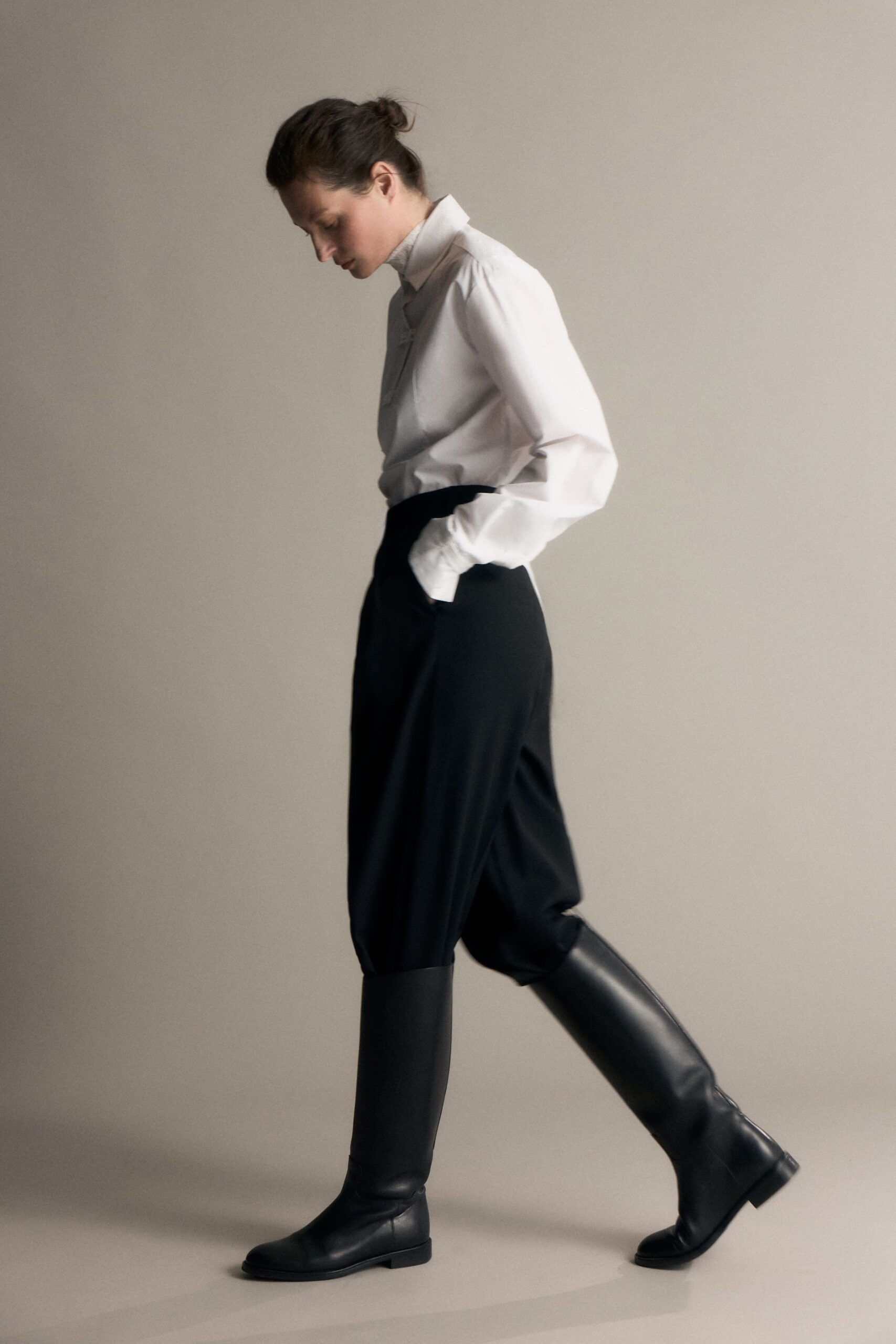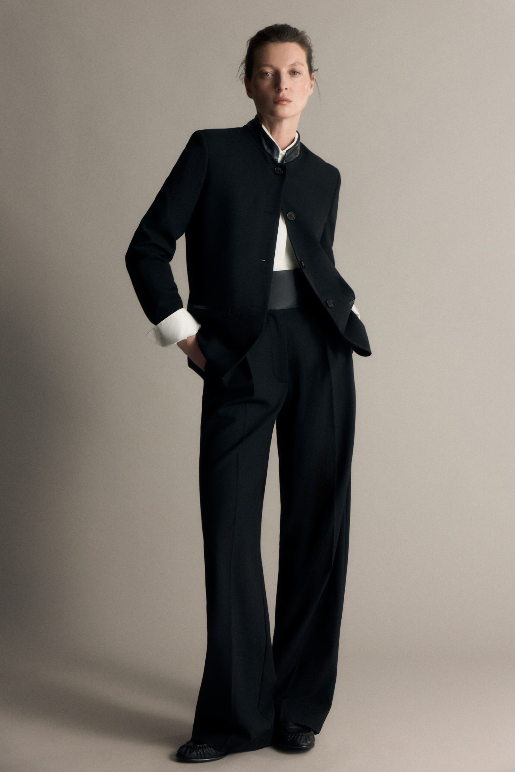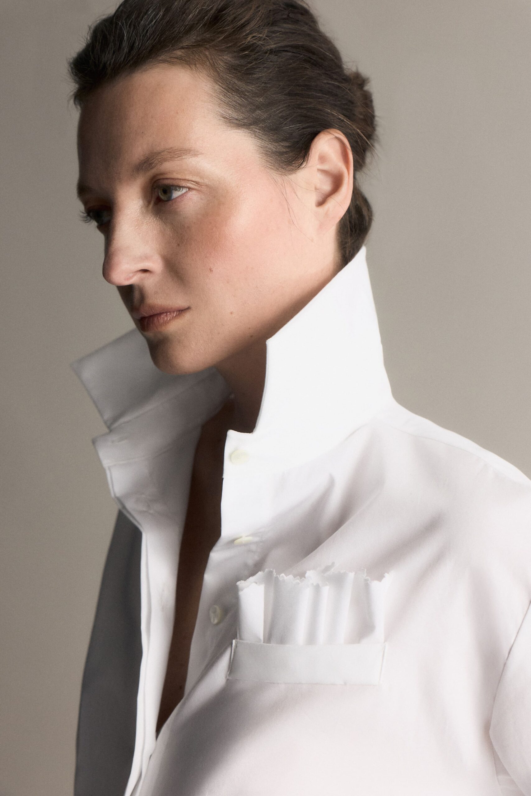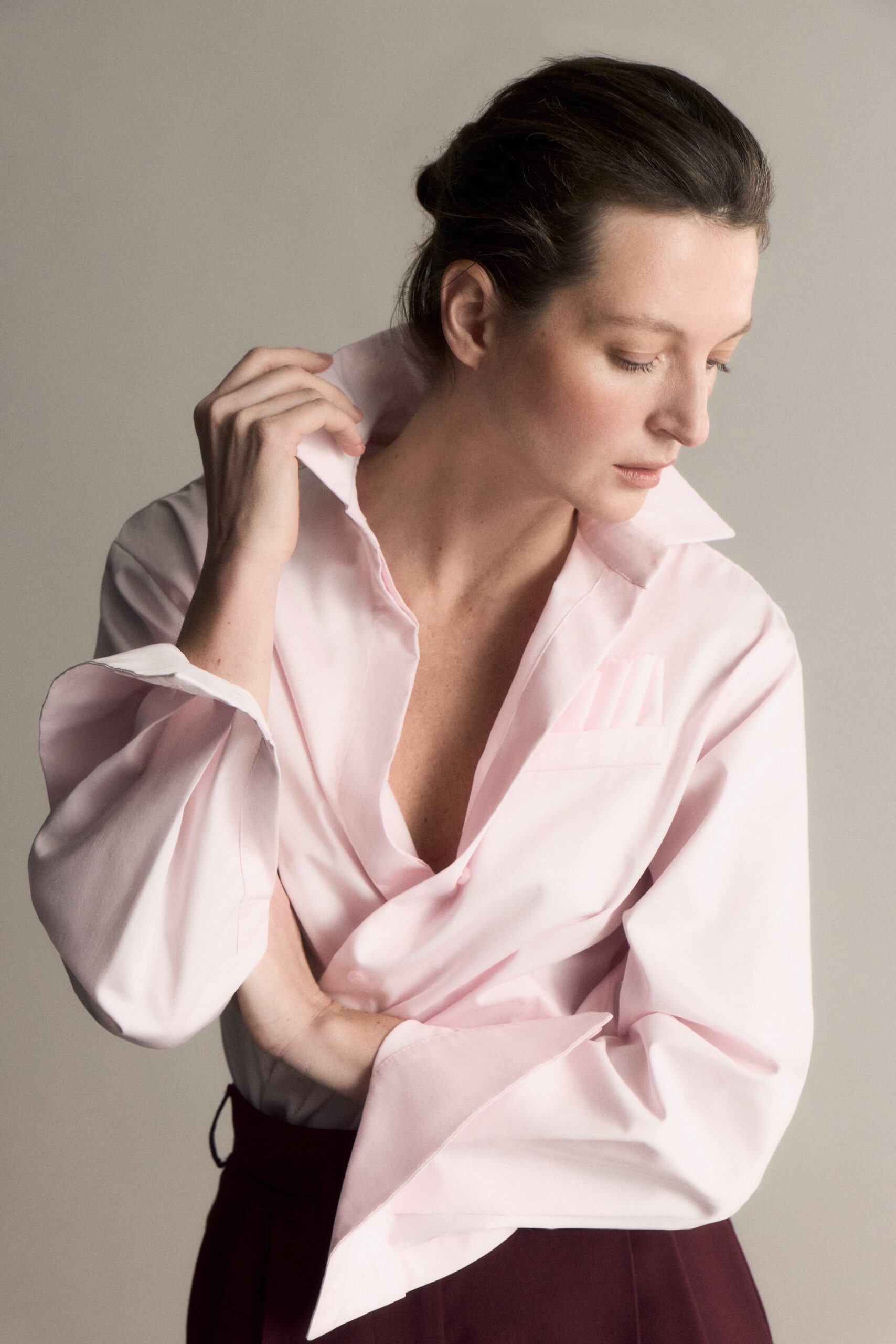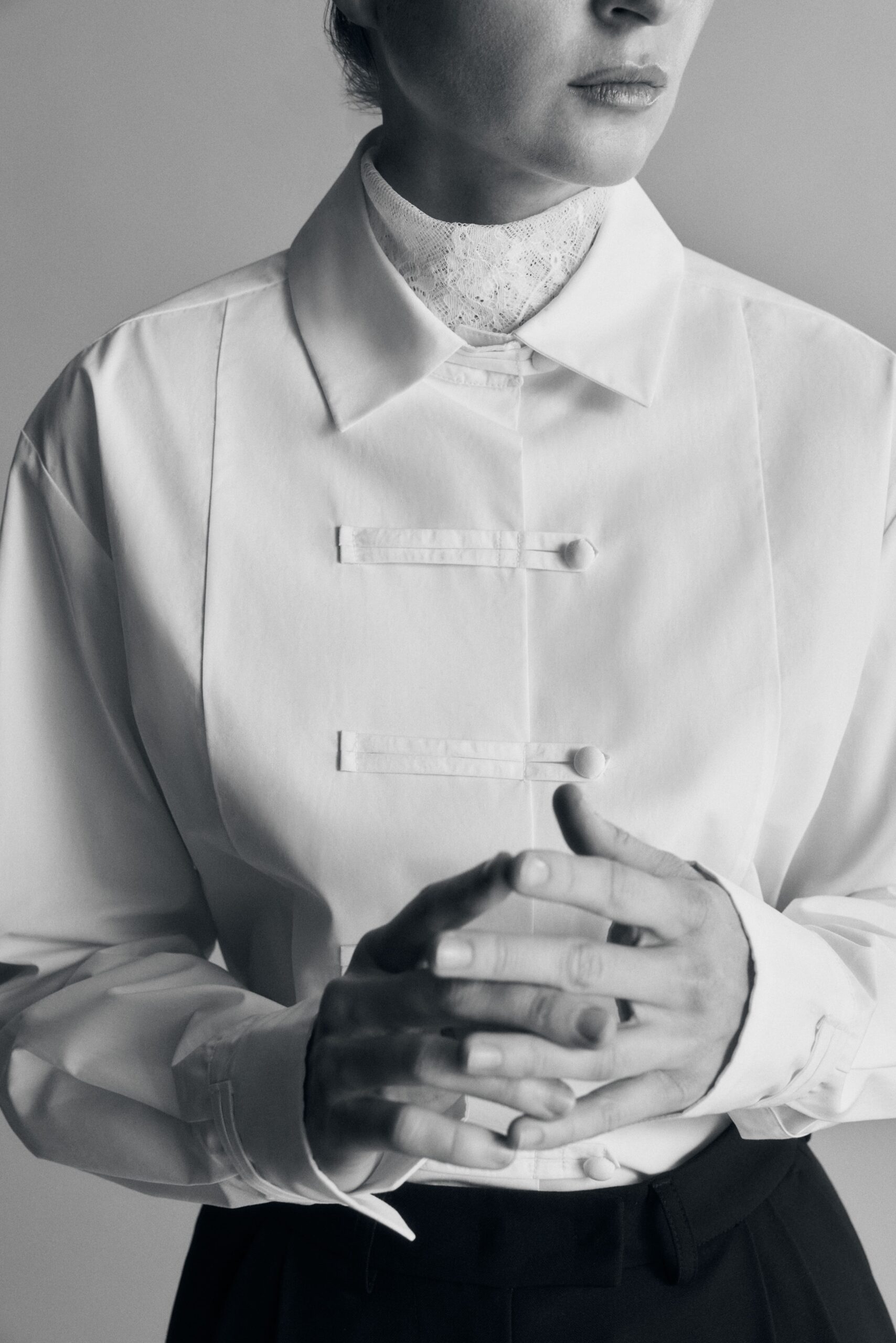 В дроп вошли шесть рубашек, созданных в миланском ателье. Все они с необычными элементами декора: застежками панкоу, пришедшими из китайского гардероба, фрачным воротником или запахом в эстетике японского кимоно и имитацией паше. Наш фаворит — рубашка N.3. Отсутствие воротника и асимметричная застежка отсылает к эстетике кимоно. В комплекте идет баска на поясе — можно носить с ней или без.