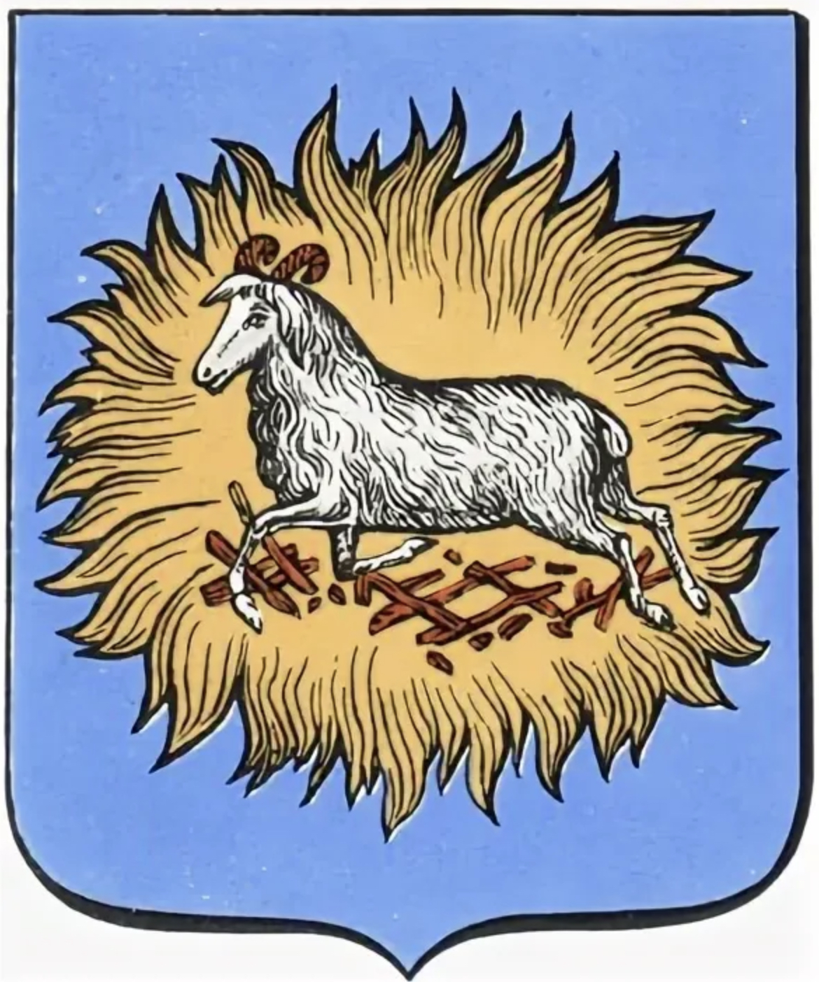«В лазоревом (синем, голубом) поле серебряный, с золотыми рогами баран, лежащий на золотых головнях; все объято червленым (красным) с золотой тонкой каймой, пламенем».