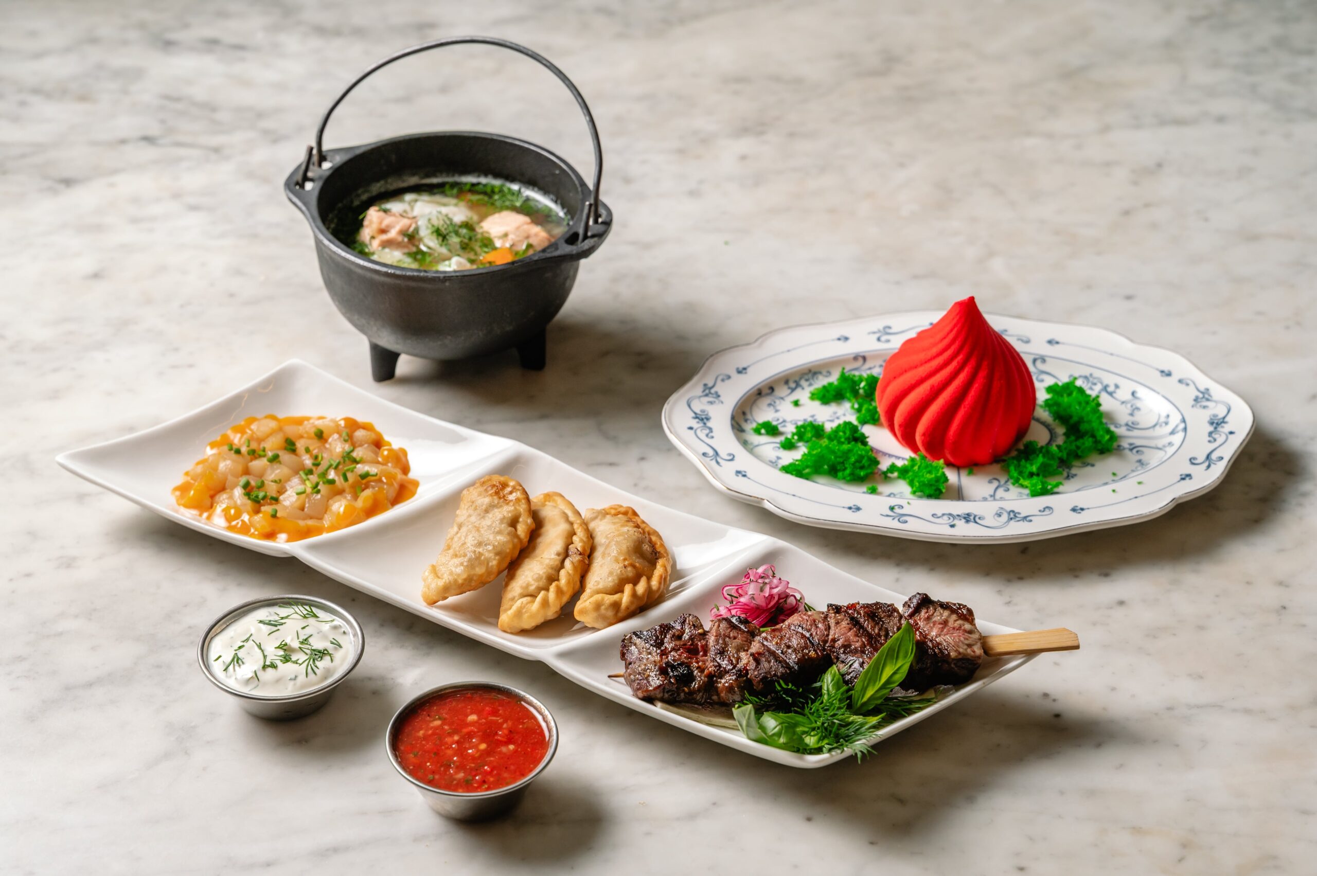 «Мы собрали гастрономическую карту России: нежный тартар Владивостока, посикунчики из Перми, уху Астрахани, шашлычок Пятигорска и десерт “Москва”», — шеф-повар Сергей Лазарев.