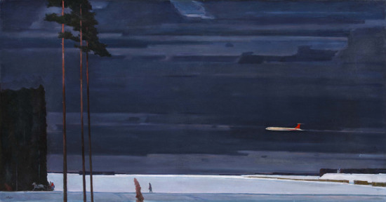 Холодное темное небо, низкий горизонт, узкая полоса заснеженной равнины и вертикали сосен обозначают бескрайний северный ландшафт, на фоне которого проносится огромный реактивный лайнер. Главный контраст к нему — маленькая лошадка с санями в левом нижнем углу, которая служит выражением прошлого и средством задания масштаба: самолет рядом с ней становится свидетельством покорения человеком пространства и времени.