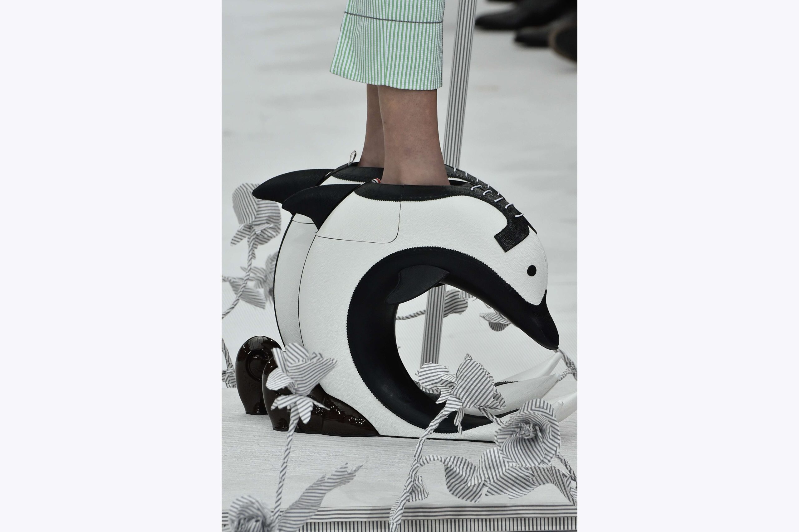 Американский модельер Том Браун в коллекции весна-лето 2020 продемонстрировал головокружительные каблуки, напоминающие дельфинов. Вот, что бывает, когда фантазия решительно преобладает над любыми представлениями о практичности.