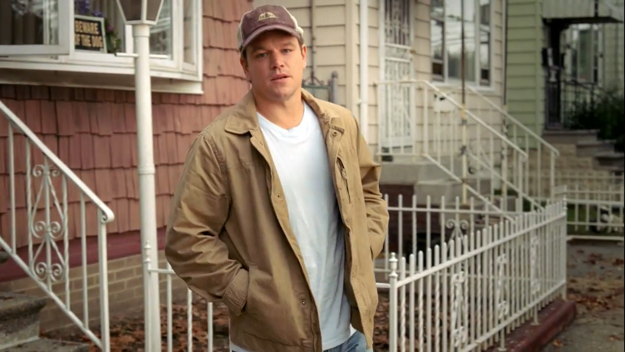 Мэтт Деймон в бейсболке и дешевой куртке смотрит в камеру: «Привет, я Стив. В последнее время дела у моей семьи так плохи, что мы приходим за помощью в продовольственный банк».