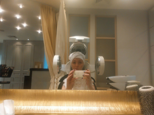 Затем мою голову завернули в полотенце, и следующие 20 минут я провела под специальным нагревающим аппаратом, который помогает полезным веществам из масляной смеси проникнуть внутрь волоса. Потом все смыли, нанесли маску для тонких волос и опять посадили под этот космический аппарат.