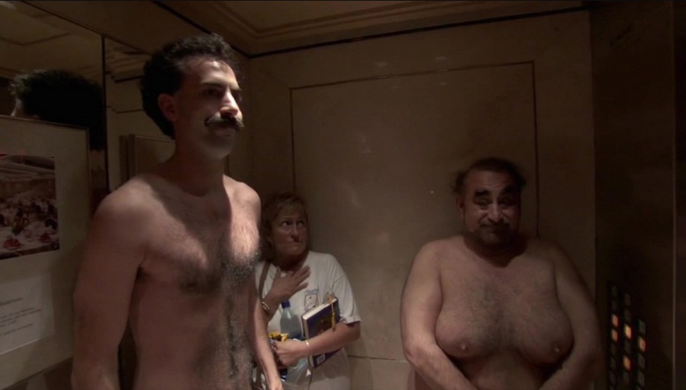 В «Борате» казахский журналист застает своего попутчика Азамата за удовлетворением себя. Помогает ему в это деле фото возлюбленной Бората — Памелы Андерсон. Двоих друзей ссора застает в неглиже. Абсолютно голые, они дерутся сначала в номере, а затем в лифте и конференц-холле, где в тот день проходило многолюдное мероприятие. Больше всего актеру запомнился момент, когда его полный коллега сидел у него на лице. С режиссером Саша договорился что, когда начнет задыхаться, постучит по кровати трижды, и пленку остановят, а актера спасут. В фильме можно видеть, как Борат трижды бьет рукой, но никто не обращает на это внимания.
