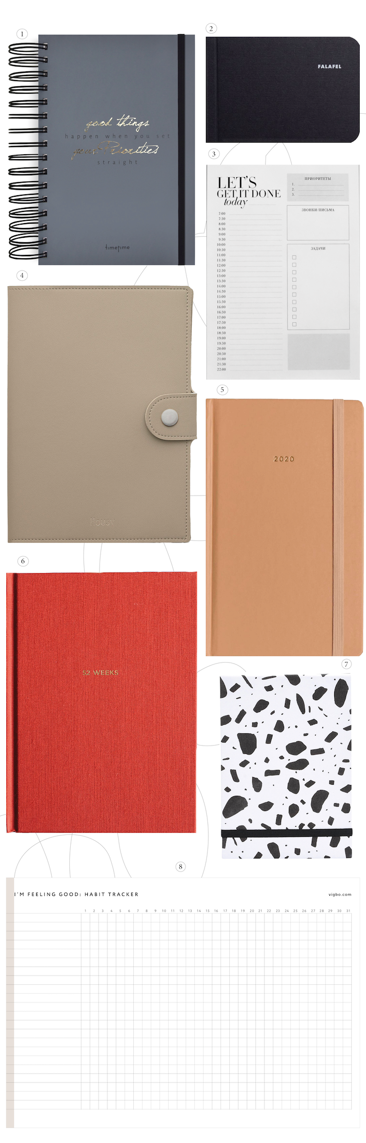 1. Мотивирующий, недатированный ежедневник из эко-бумаги с уникальной системой планирования, которая поможет идти к намеченным целям с помощью грамотного расставленная приоритетов TIMETIME (купить за 2590 руб.) 2. Блокнот с точечной разметкой Falafel Black A7 с небольшим изъяном и сложной судьбой Falafel Books (купить за 190 руб.) 3. Отрывной блокнот для планирования научит грамотно распределять время в течении дня и всегда помнить о важном Daily Planner Lanceplans (купить за 680 руб.) 4. Деликатный ежедневник из дизайнерской бумаги Munken цвета айвори с обложкой из качественной экокожи Housy Planner (купить за 2180 руб.) 5. Минималистичный датированный ежедневник в твердом переплете My Special Planner (купить за 2000 руб.) 6. Ежедневник 52 WEEKS поможет увидеть общую картину — что вас окружает, из чего складывается ваша жизнь, а также понять, что вам мешает и чего недостает 365done (купить за 900 руб.) 7. Компактный блокнот на резинке с нелинованными страницами NORMANN COPENHAGEN (купить за 1500 руб.) 8. Планер для контроля и закрепления новых привычек Vigbo (скачать бесплатно)