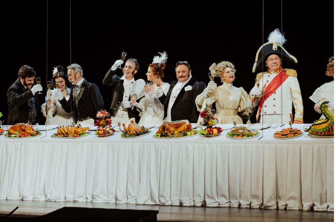 Журналистское клише «звездный состав» часто мелькает в описании многих спектаклей, но в этот раз это действительно не преувеличение. Ирина Муравьева в роли хозяйственной Коробочки, суетливый Плюшкин в исполнении Василия Бочкарева, резкий Собакевич Бориса Невзорова, манерный Манилов Александра Клюквина, растерянный губернатор Владимира Носика – каждый из персонажей блестяще сыгран звездами российской сцены.
