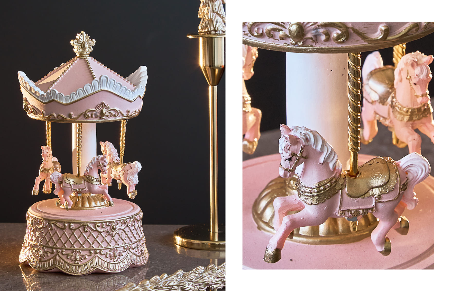Новогодняя карусель — идеальный подарок для друзей с детьми. Классическая праздничная мелодия, скачущие по кругу лошадки, зефирно-розовый цвет — карусель выглядит действительно сказочно. У нее есть все шансы стать любимым семейным новогодним украшением, которое каждый год с трепетом и восторгом достают из коробки в самом начале праздничного сезона. Кстати, батарейки менять не понадобится — карусель полностью механическая.