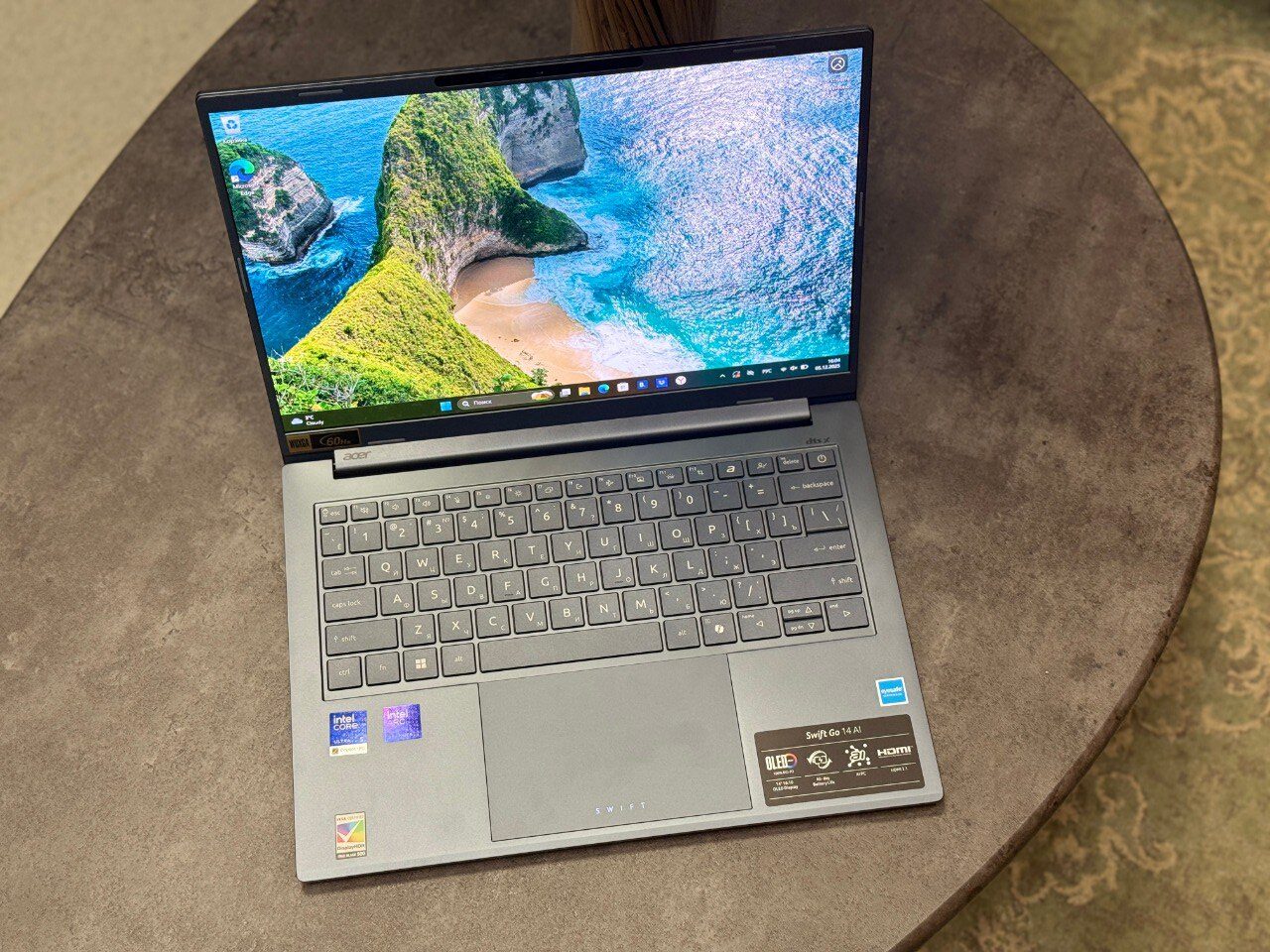 При минимальной толщине от 9,7 мм и весе всего 1,24 кг Swift Go 14 легко помещается в рюкзак или компактную сумку. В повседневном использовании это сразу дает о себе знать, ноутбук не ощущается обузой в дороге и практически не утяжеляет ручную кладь. Его габариты 312,4 × 227,4 × 15,95 мм позволяют комфортно использовать устройство даже в поездках, кафе или на рабочих встречах, не испытывая нехватки свободного пространства.