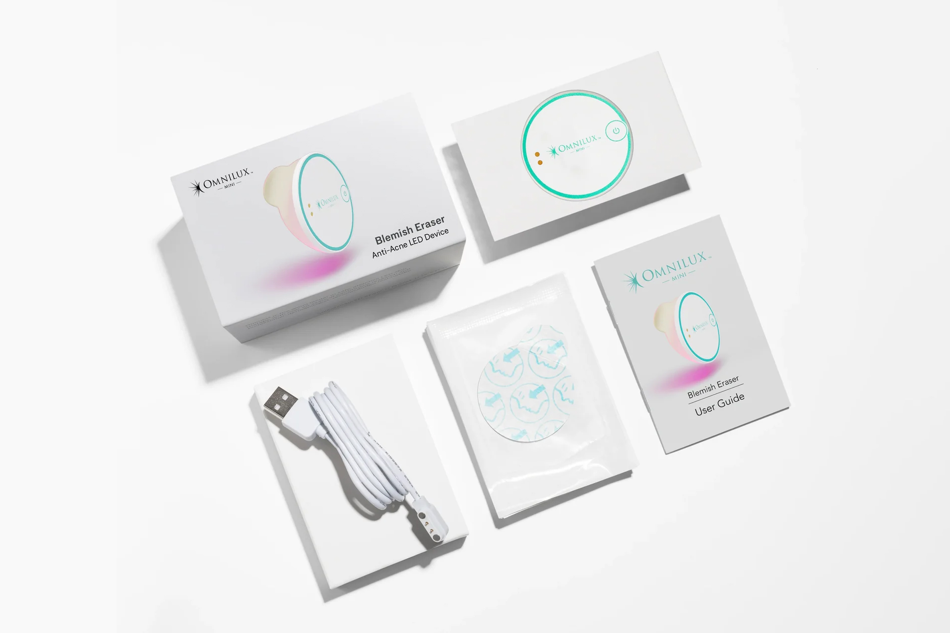 Omnilux Mini Blemish Eraser — светодиодный прибор для ухода за кожей. Он использует клинически проверенные длины волн света (синий и красный) для лечения акне и высыпаний. В комплект также входят 14 одноразовых гидроколлоидных патчей с салициловой кислотой и зеленым чаем.