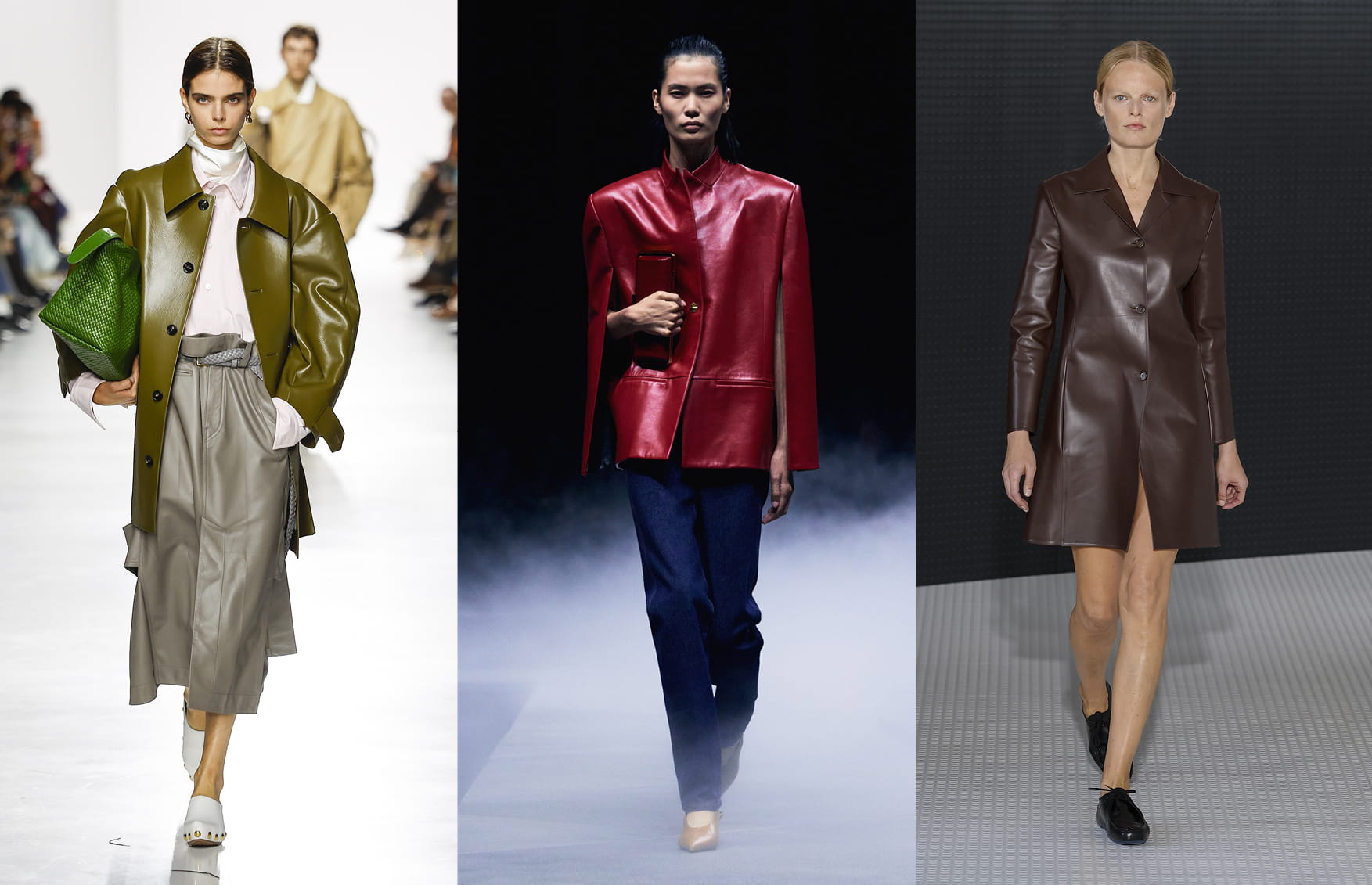 Кожаные жакеты, рубашки и брюки остаются актуальными, но в новом исполнении: сочные цвета, неожиданные оттенки (например, оливковый или лазурный) и мягкие формы.