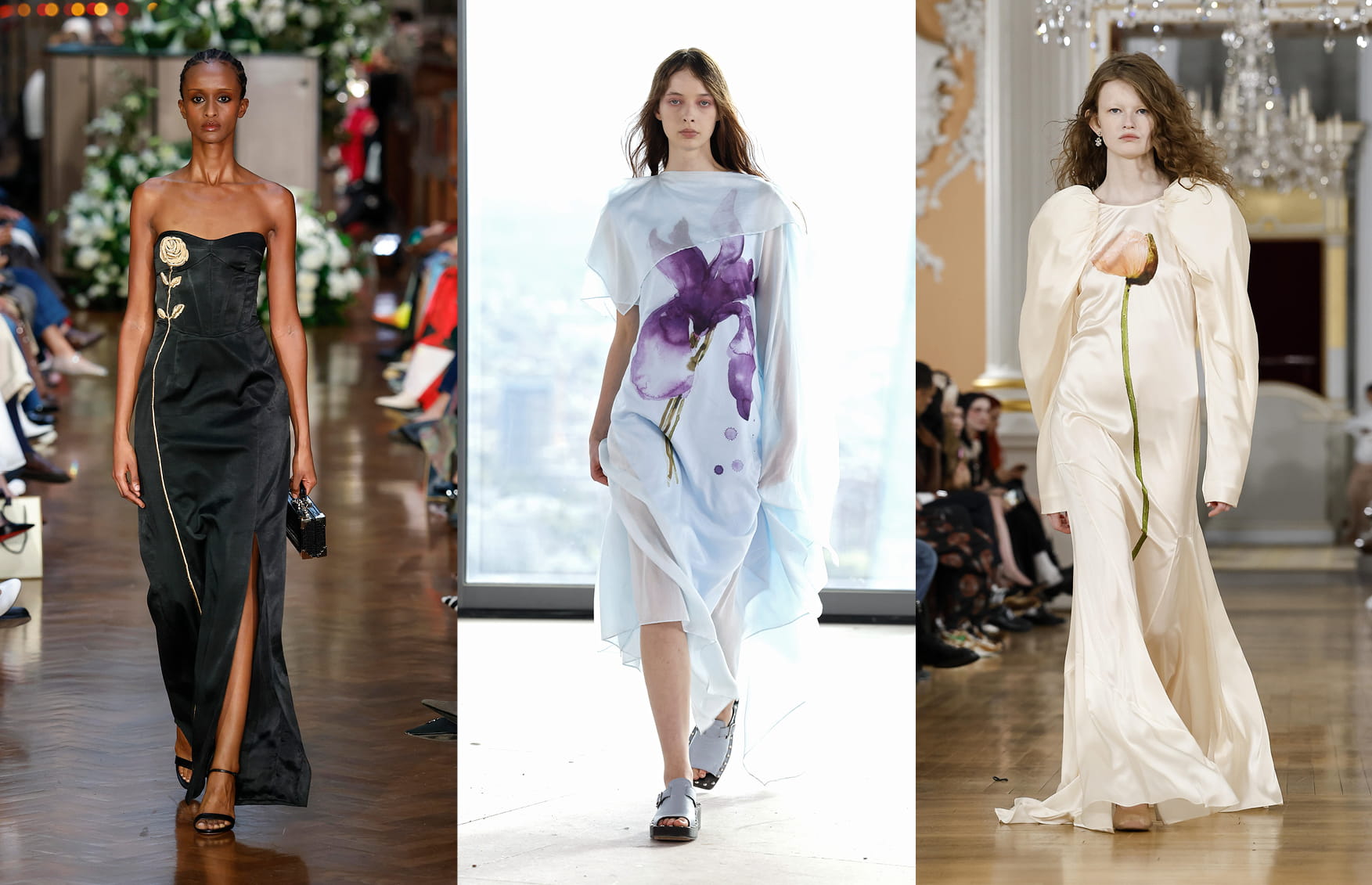 Забудьте о цветочных букетах на платьях и блузах. Весной 2026 актуален один, но выразительный цветок. Роза у Патрика Макдауэлла, сирень у Marques’Almeida — слегка несовершенные, будто нарисованные от руки или вышитые нарочито небрежно.