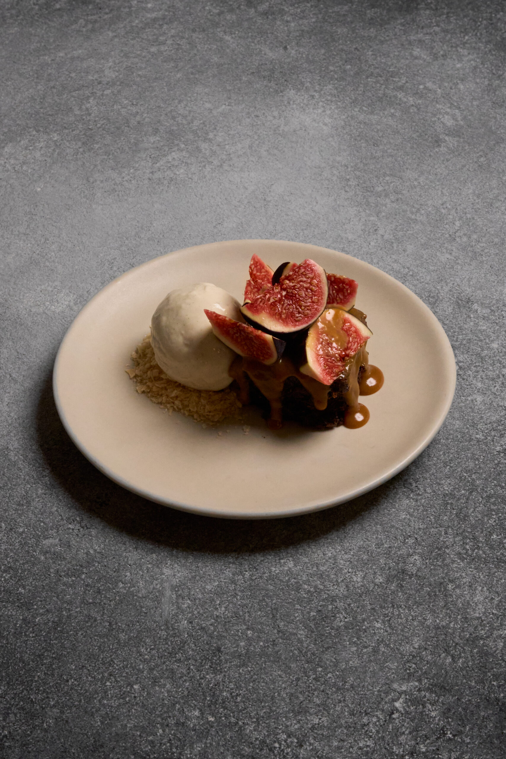 - Копченый брауни, мисо карамель, пломбир, хурма.
