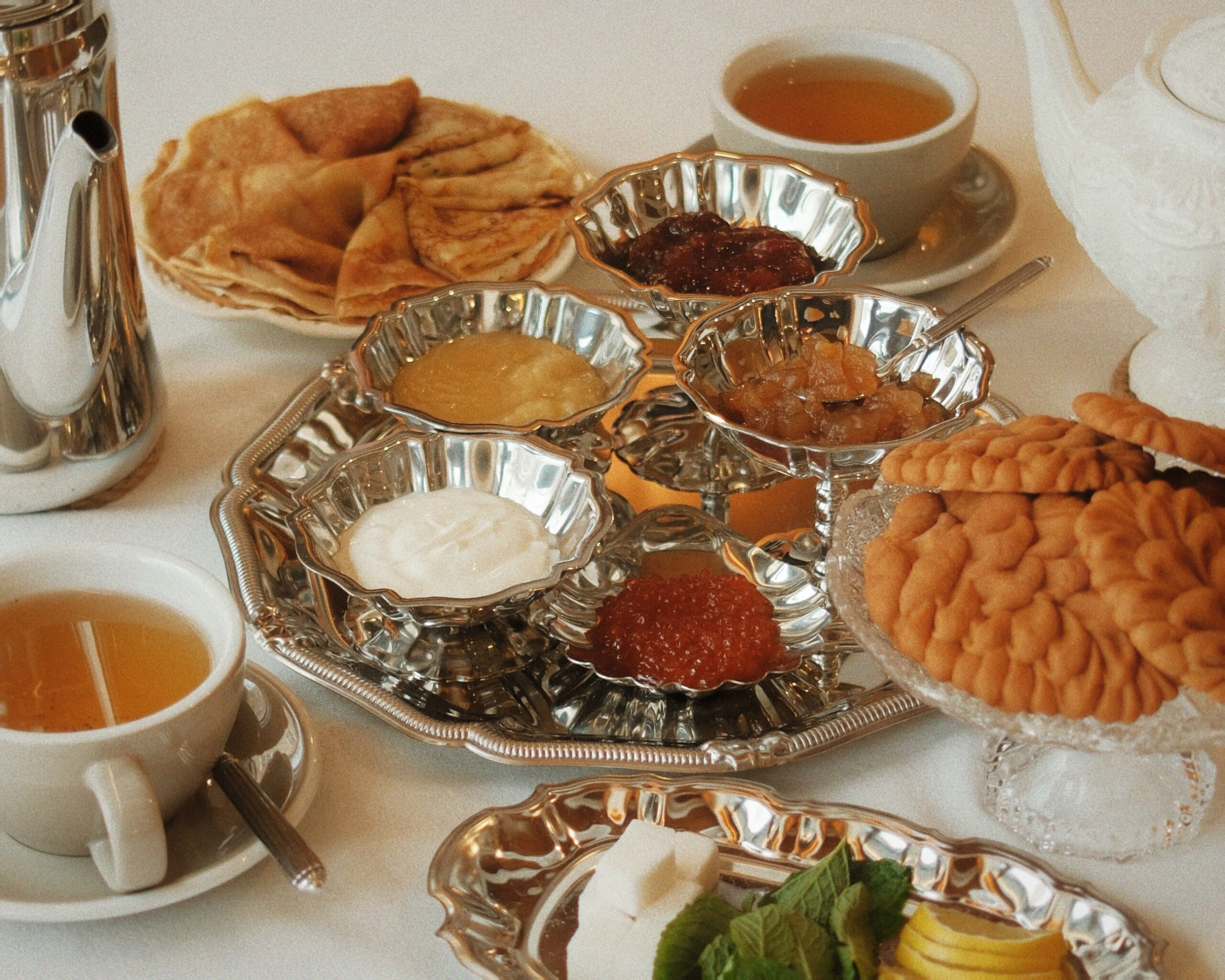 - «Дачное чаепитие» (на 3–4 гостей): чай «Травяной сбор», имбирные пряники, два вида домашнего варенья, домашние блины, красная икра, сметана, тамбовский лесной мед, сахар-рафинад, лимон, свежая мята.