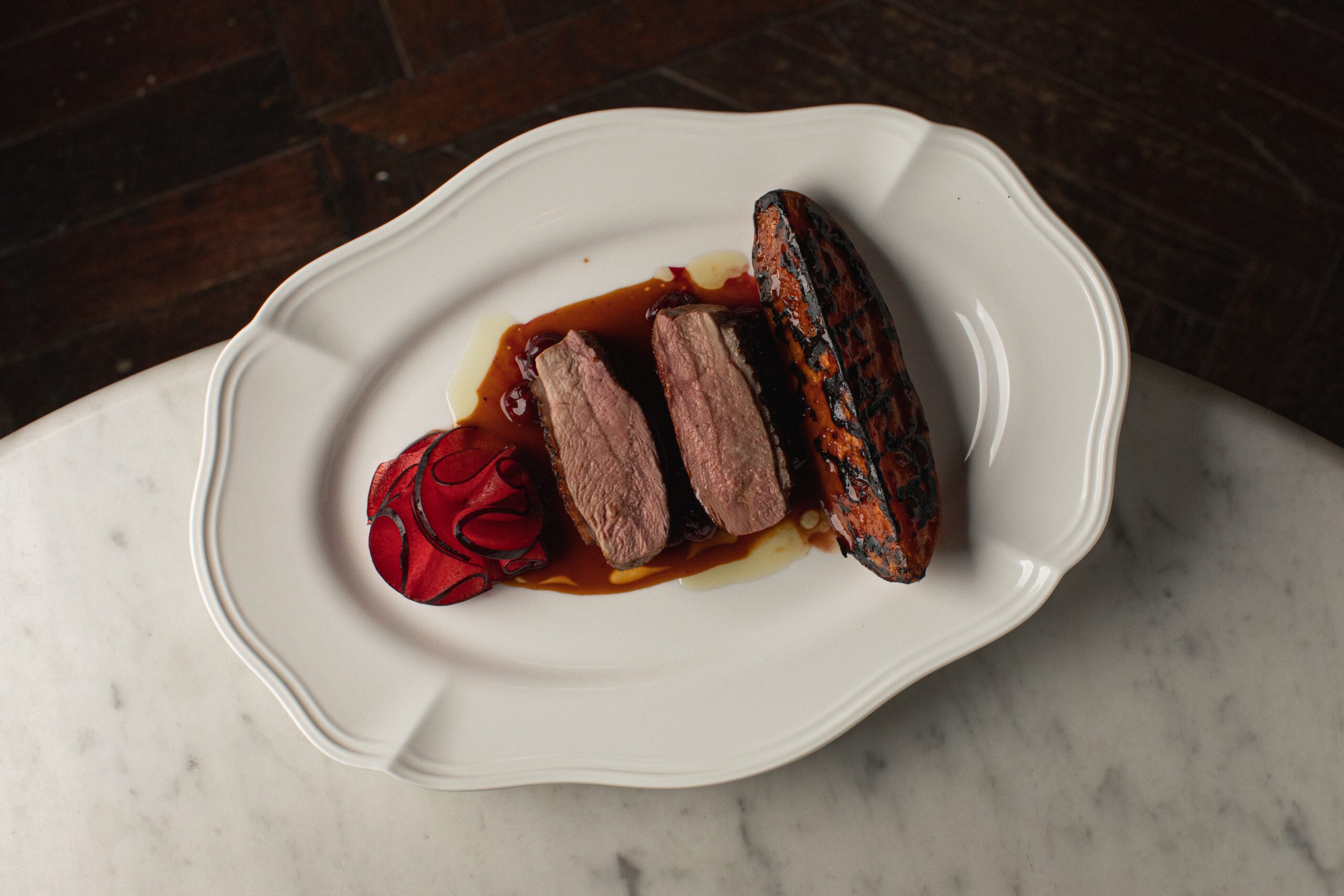 - Утиная грудка, морковь BBQ, соус из тыквы и розы;