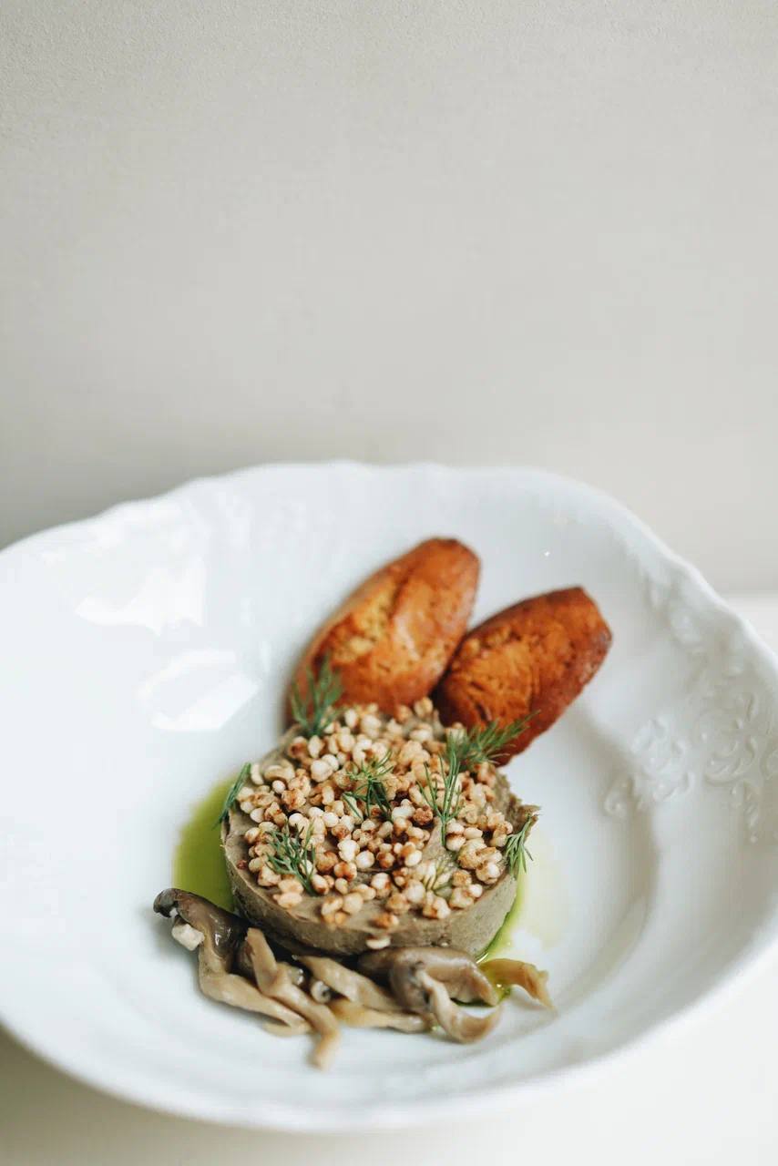 - Паштет из белых грибов с попкорном из гречки — 850 руб.;
