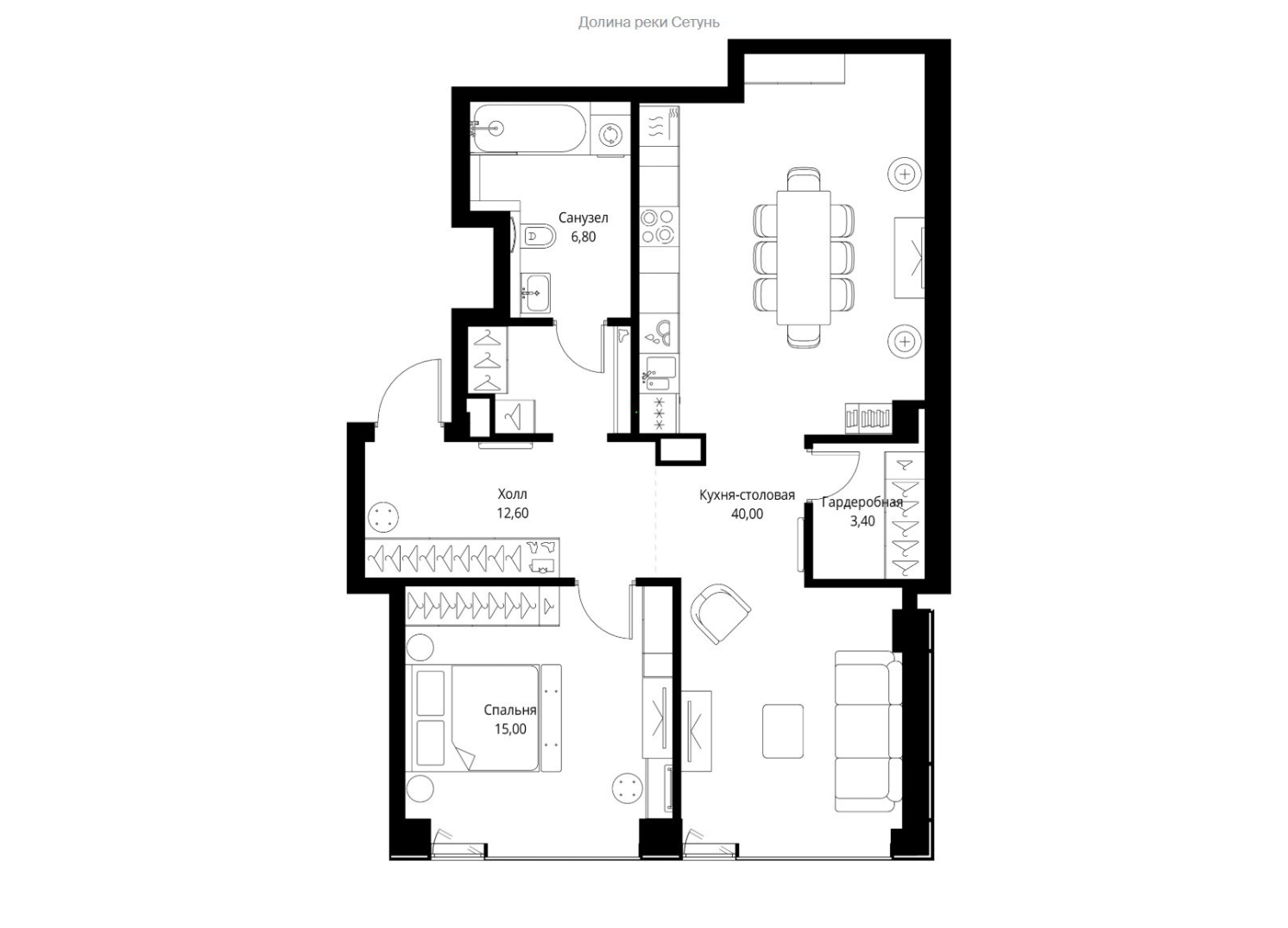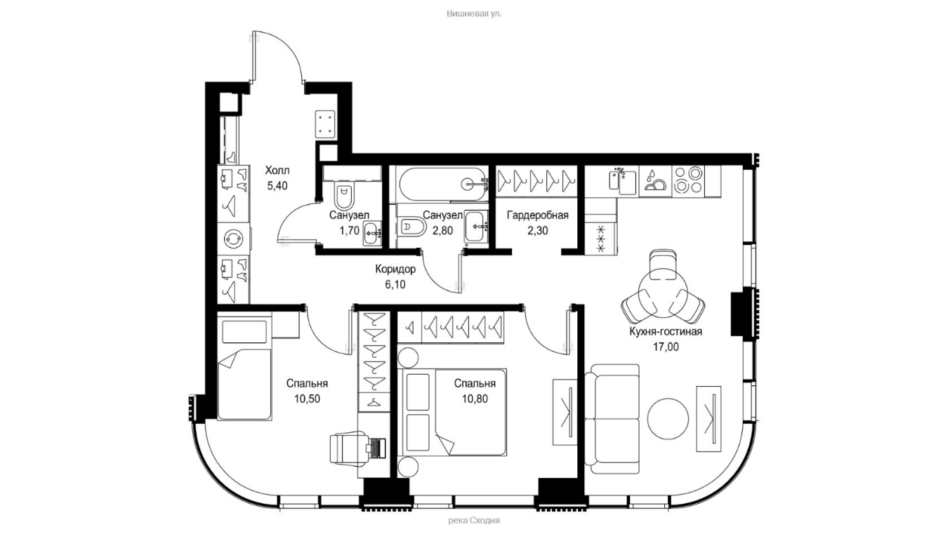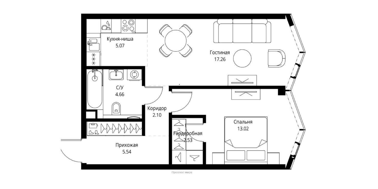 Проектировщики разместили кухню, санузел и ванную вокруг инженерного ядра, освободив остальное пространство квартиры от излишних коммуникаций.