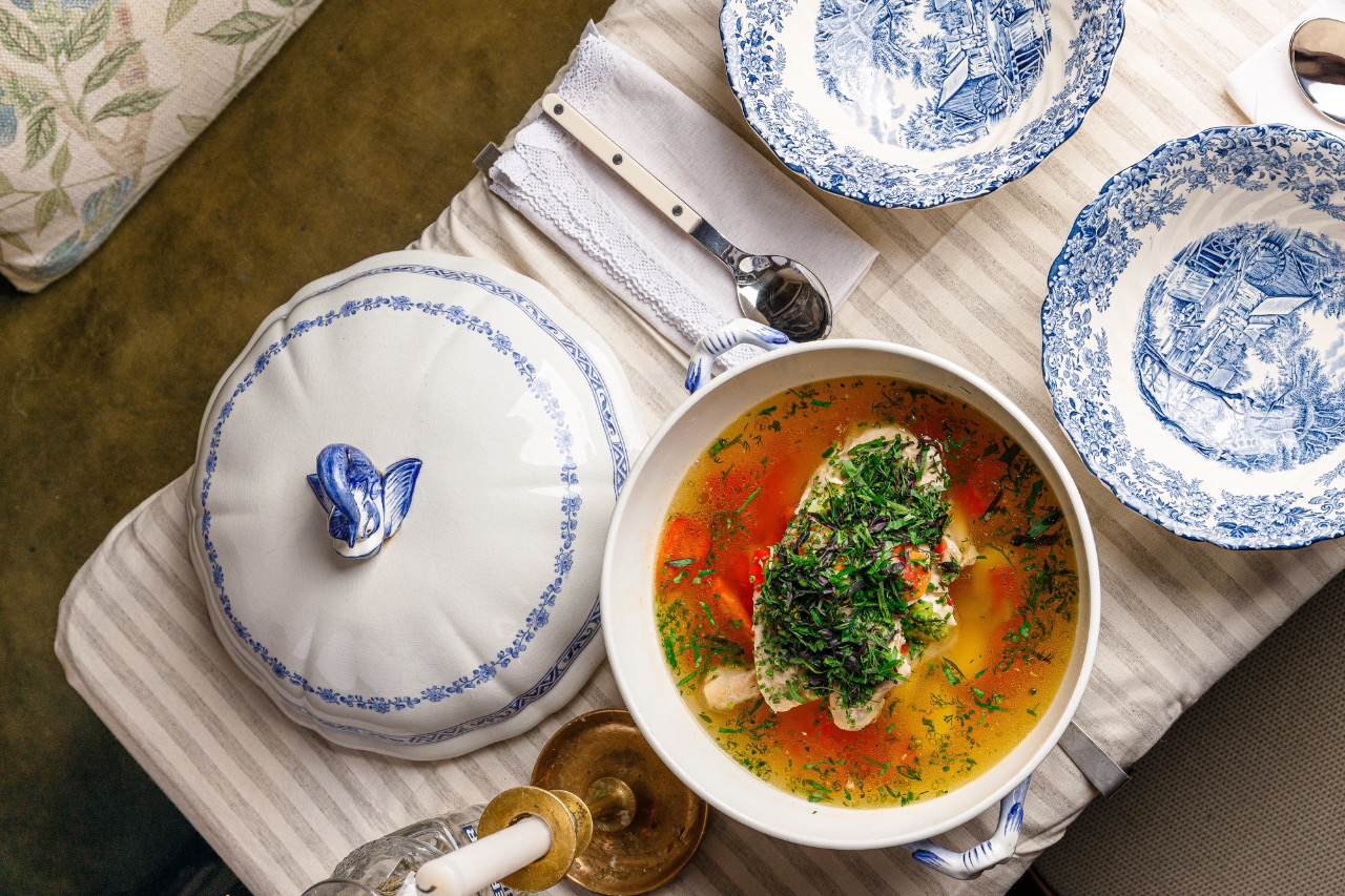Ресторан предлагает идею зимнего романтического свидания — суп из петуха на двоих, поданный в винтажной супнице с серебряным половником.