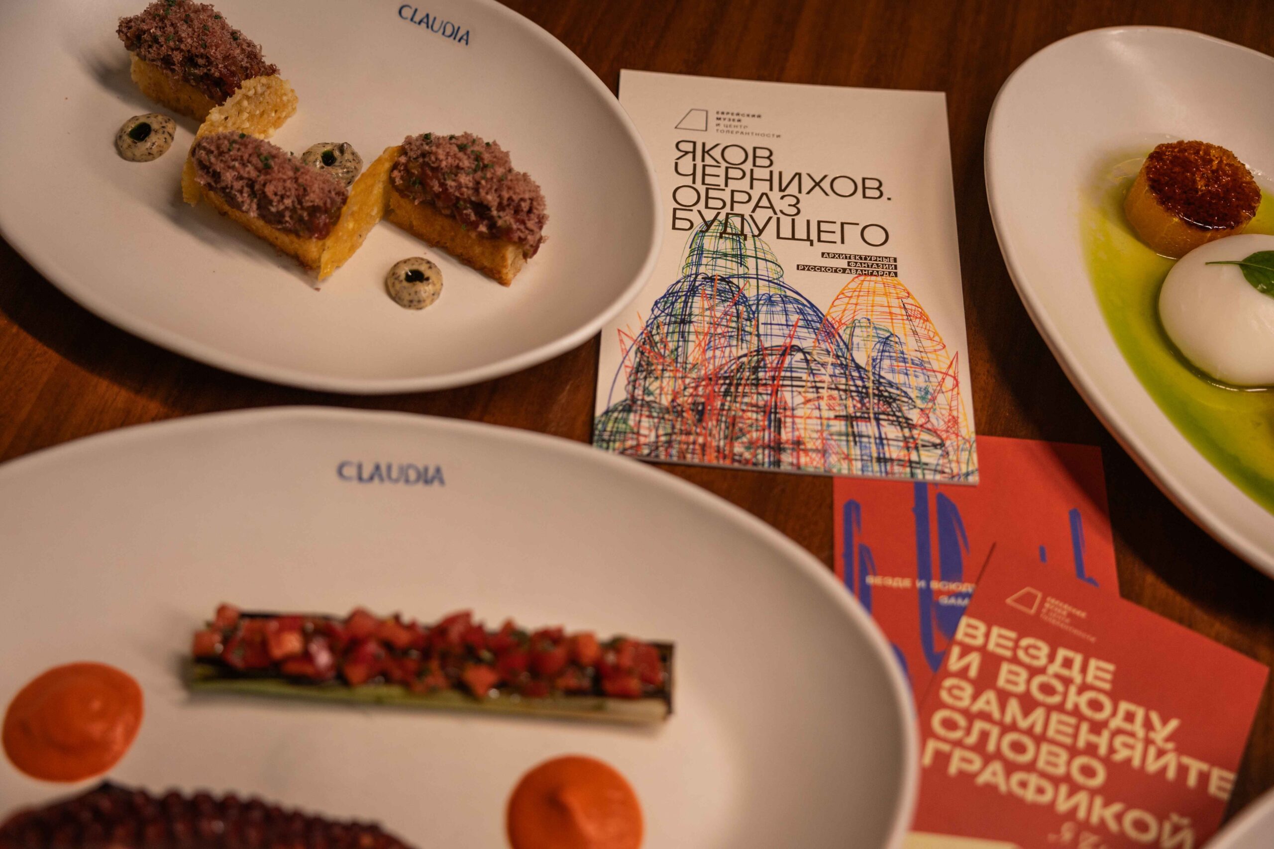 До 30 ноября в ресторане действует специальное меню, созданное в коллаборации с Еврейским музеем и центром толерантности в честь выставки «Яков Чернихов. Образ будущего. Архитектурные фантазии русского авангарда». Пять блюд, так или иначе, напоминают о проектах советского архитектора. Каждый, кто закажет десерт из этого меню, получит приглашение на выставку на две персоны.