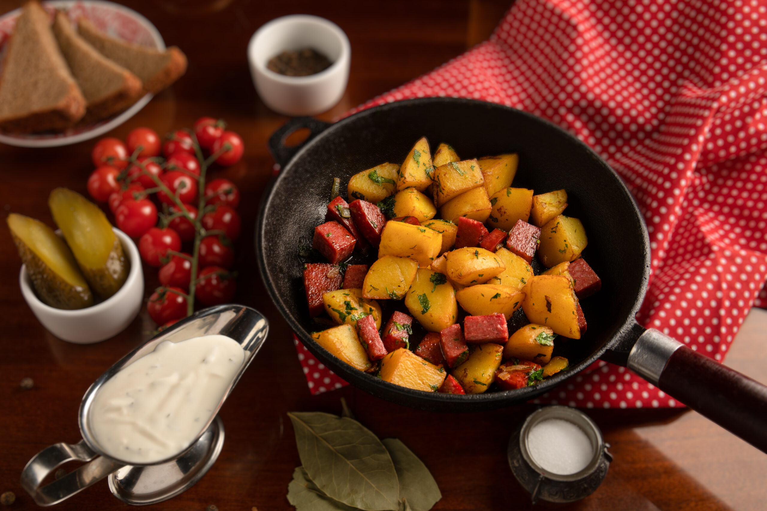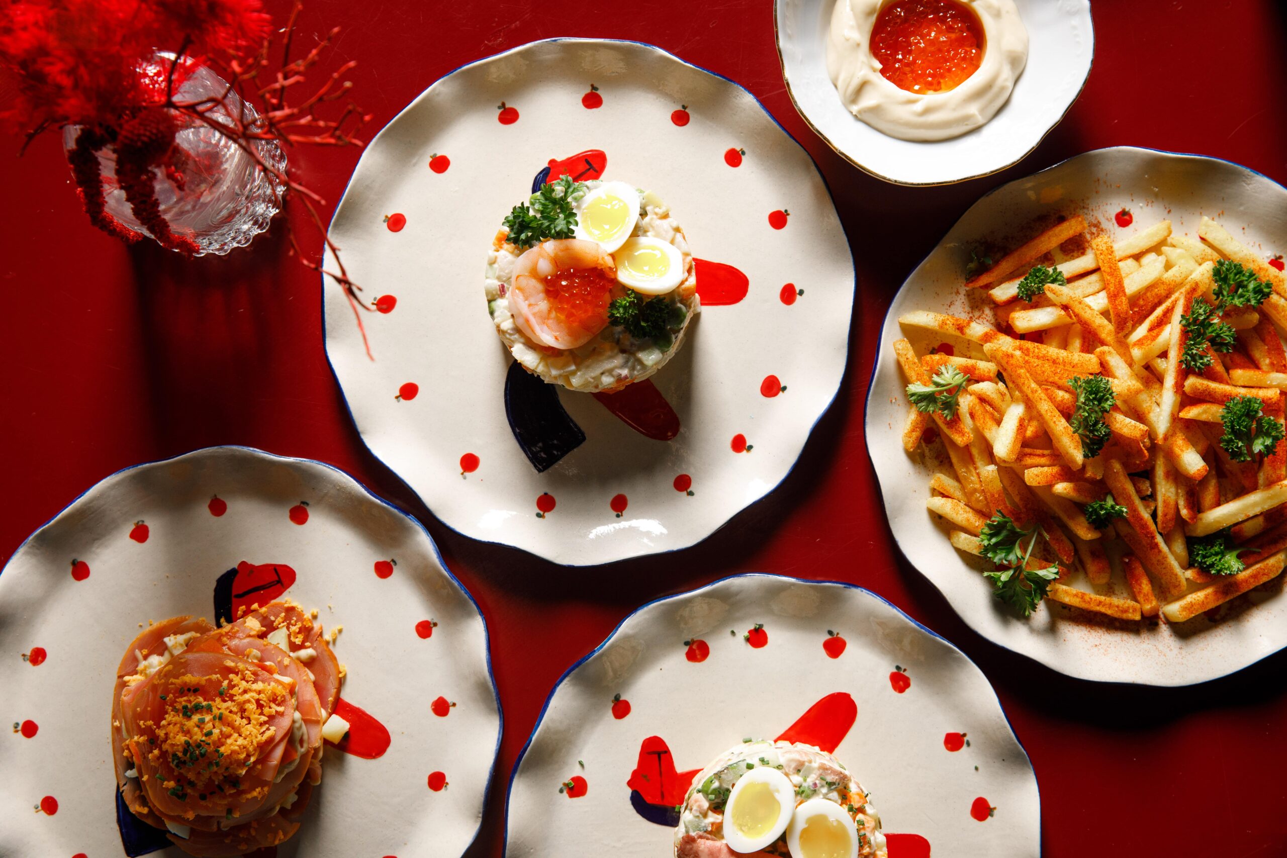 Шефы Олег Кусов и Андрей Титов придумали праздничное новогоднее меню. В нем сразу два вида оливье — с телятиной и с креветками и красной икрой, мимоза с копченым тунцом и, конечно, картошка фри. В зимней версии она подается с красной икрой и соусом тоннато. Тарелки для этого меню, кстати, особенные — созданы специально в гончарной мастерской Volna Ceramics.