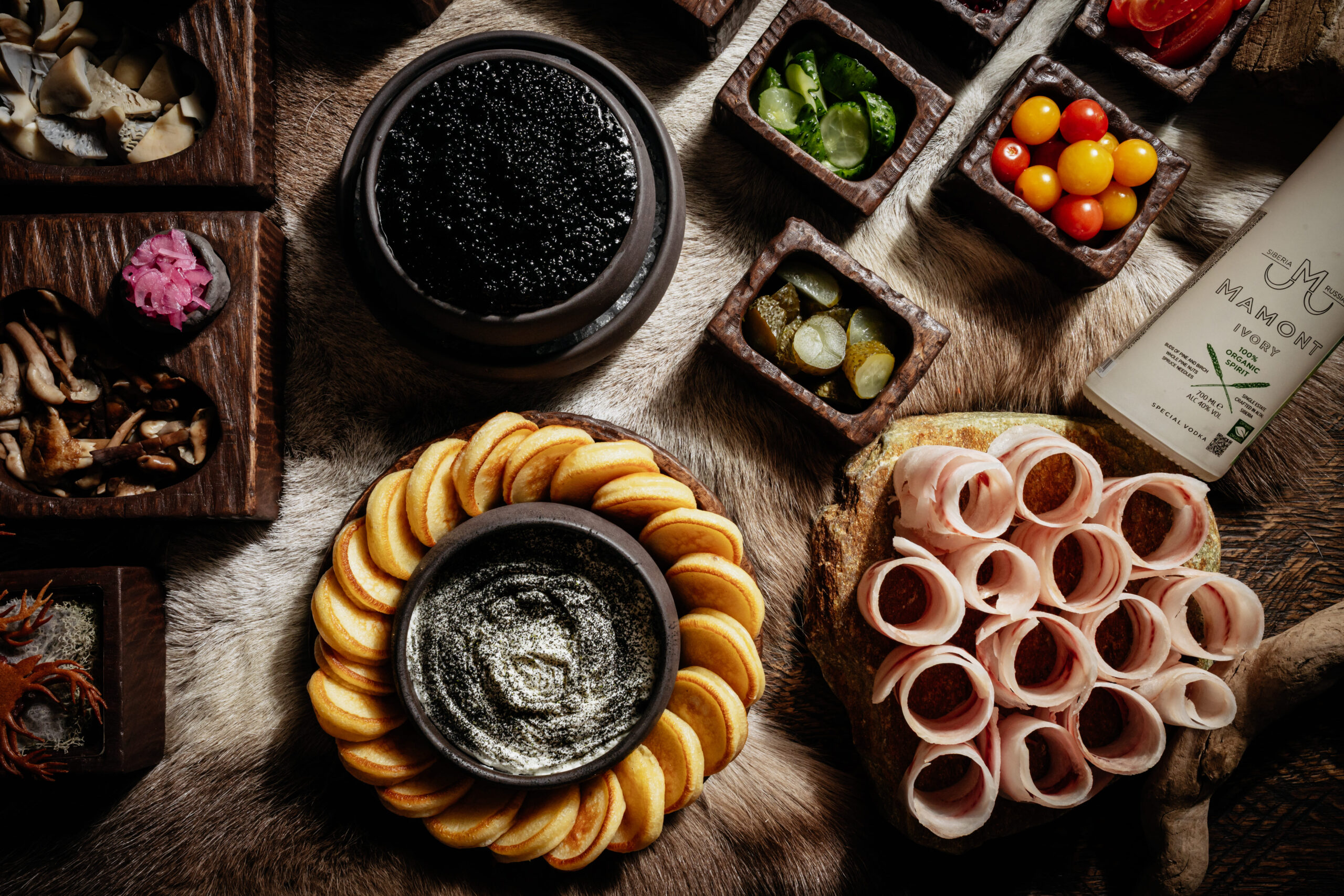 Томленая томичина, прозрачная строганина и пышные оладьи с осетровой икрой — лишь начало большого «Сибирского застолья» за 95 000 рублей, в которое входит килограмм черной икры. Шеф Виктор Шаидецкии воссоздал купеческий стол с дичью, муксуном и десятком солений и подает его как двухактное представление — в аутентичнои керамике и на резных тарелках.
