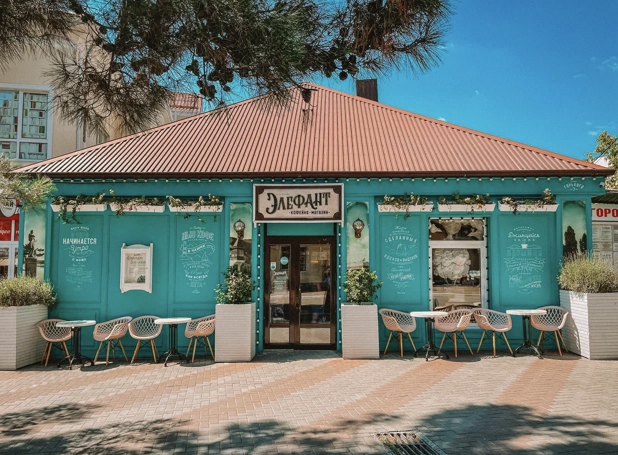 «Элефант». Пожалуй, главное хипстерское местечко Геленджика, явно выделяющееся на фоне других заведений на центральных улицах города. Это кофейня, выполненная в винтажном стиле и окрашенная в бирюзовые цвета. Внутри можно не только попробовать один из самых вкусных кофе в городе и выпечку, но и присмотреть сувениры, а также приобрести редкие напитки. За зеркальной дверью «Элефанта» скрывается уютный дворик, где можно скрыться от посторонних глаз.