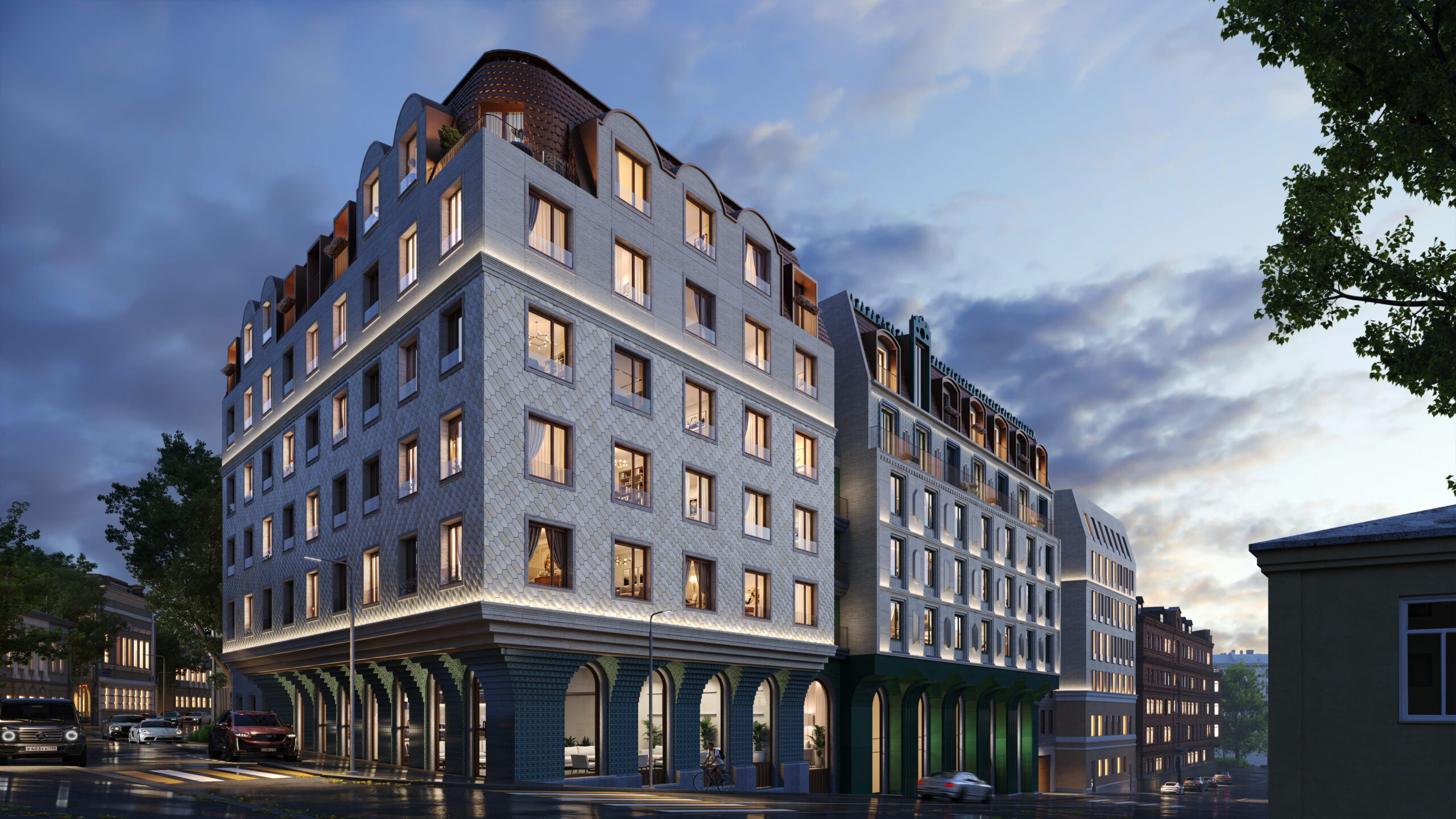 Архитектурная концепция выполнена в стилистике неорусского модерна и включает фасады с декоративной пластикой, керамикой, характерными элементами (кокошники, мансардные решения), а также интеграцию отреставрированного исторического фрагмента. Проект разработан совместно с архитектурным бюро Megabudka.