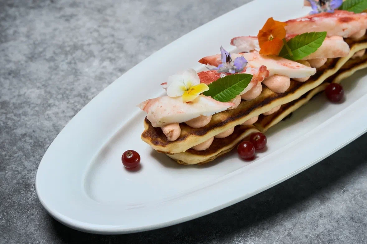Тут вам и аристократичные слоеные блины с икрой и крем-фрешем под шампанское, и фаворит шефа в стиле жульен — с индейкой и белыми грибами. Но главная фишка — рецепты гостей. Например, Владимир просил приготовить его любимое сочетание, в котором белков больше, чем углеводов — так в меню появились три пшеничных блина с красной икрой, лангустинами и лососем.