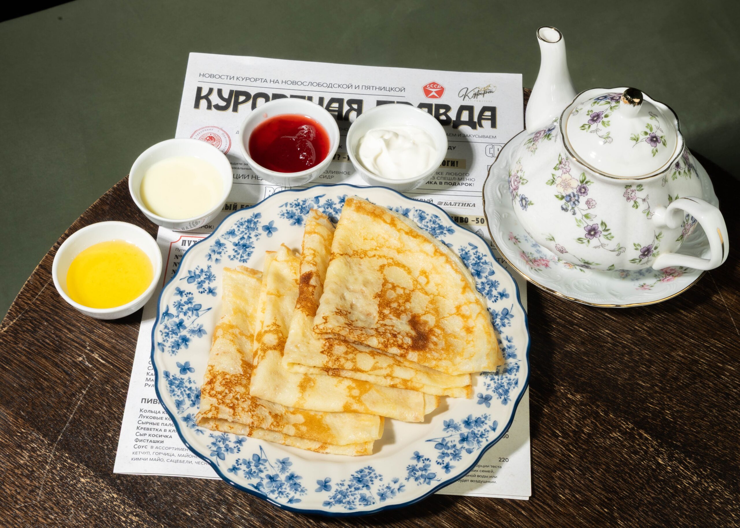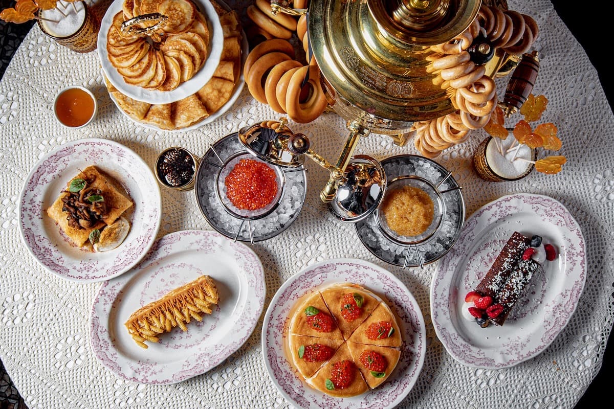 Шеф-повар Роман Чистов в этом году экспериментирует: подает блины с медвежатиной, подкопченной белугой и костромскими сырами. Консерваторам понравятся тонкие, почти прозрачные — с осетровой икрой и фирменной водкой. А на сладкое шеф-кондитер Никита Гавриленко предлагает двойную ностальгию: шоколадный блин с мороженым и клубничный — с припеком.