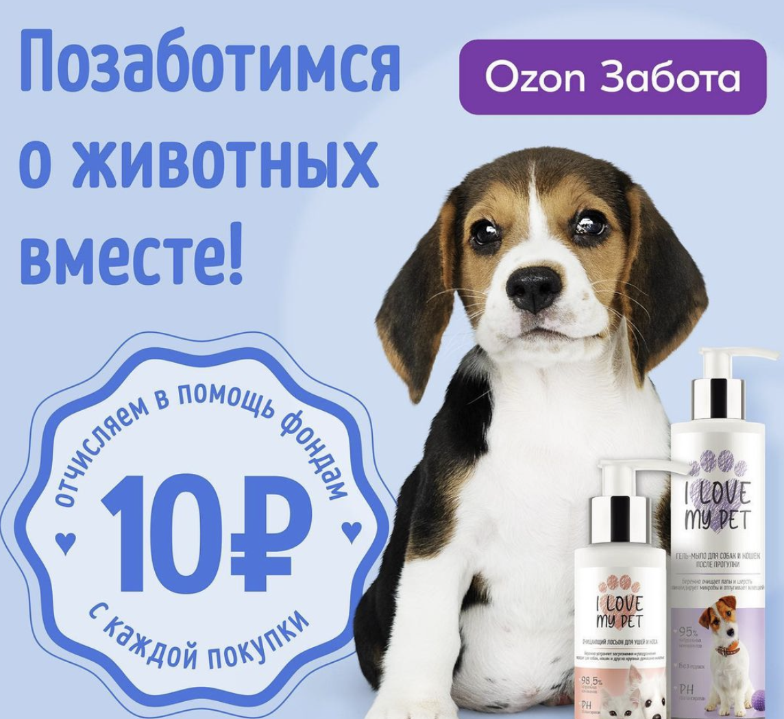 С каждой покупки любого из продуктов I LOVE MY PET на маркетплейсе OZON бренд перечисляет 10 р. в один из фондов: «РЭЙ», «Собаки, которые любят» и «Помощь бездомным беспородным животным»*.