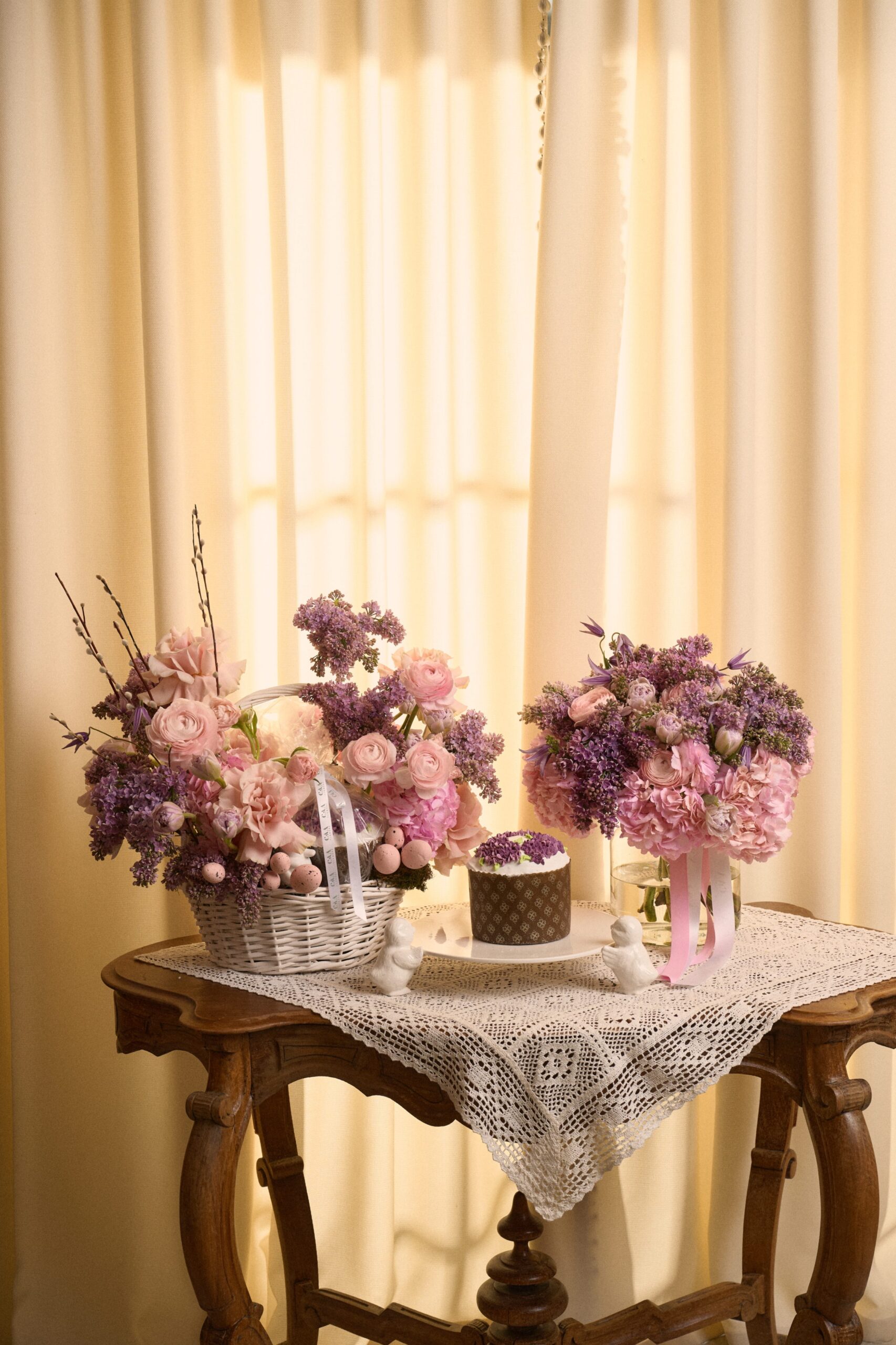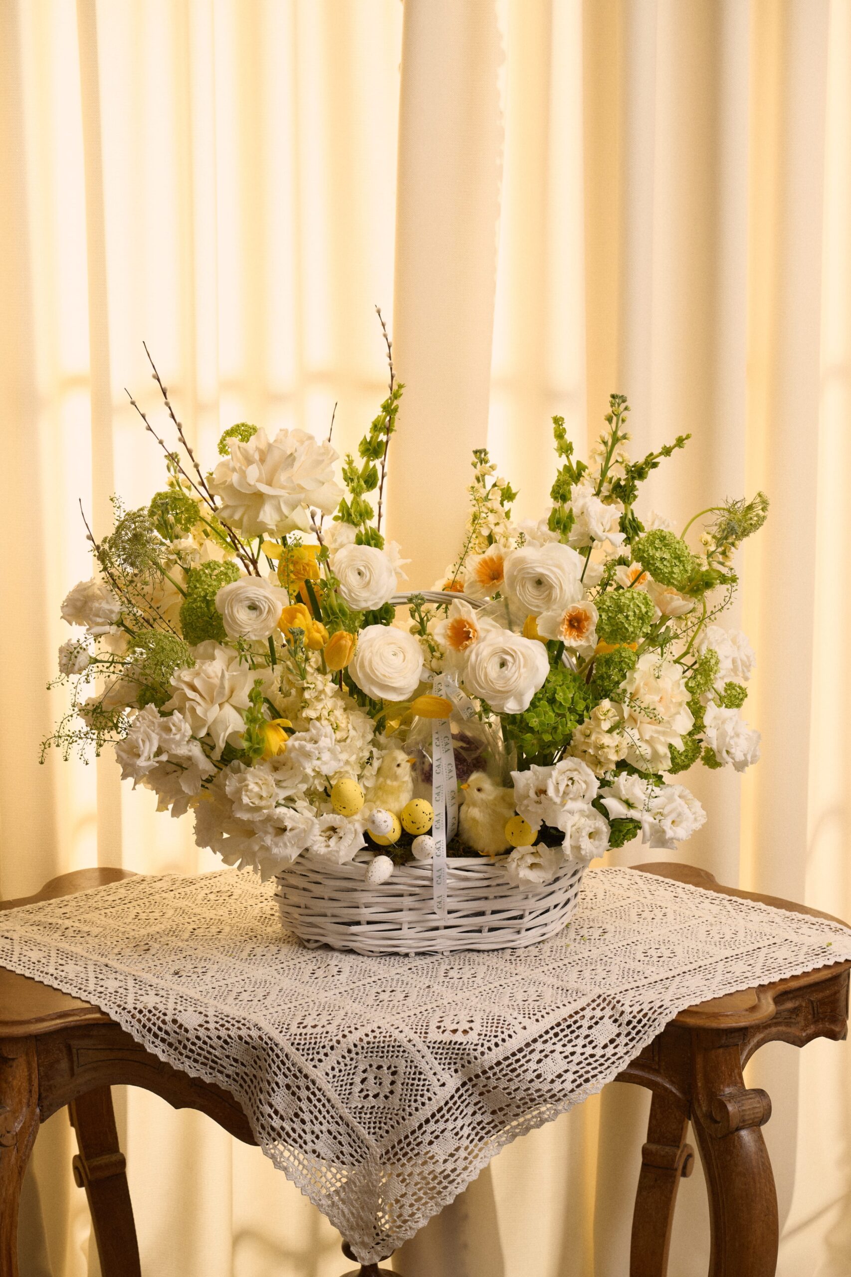 Эффектные букеты мы нашли во флористическом бутике САД flowers. В основе коллекции — как раз те самые композиции в мягкой пастельной гамме с акцентами солнечного желтого. Каждая работа дополнена пасхальным декором и фирменной упаковкой. Ключевой элемент коллекции- пасхальные корзины с куличом от ресторана Probka.