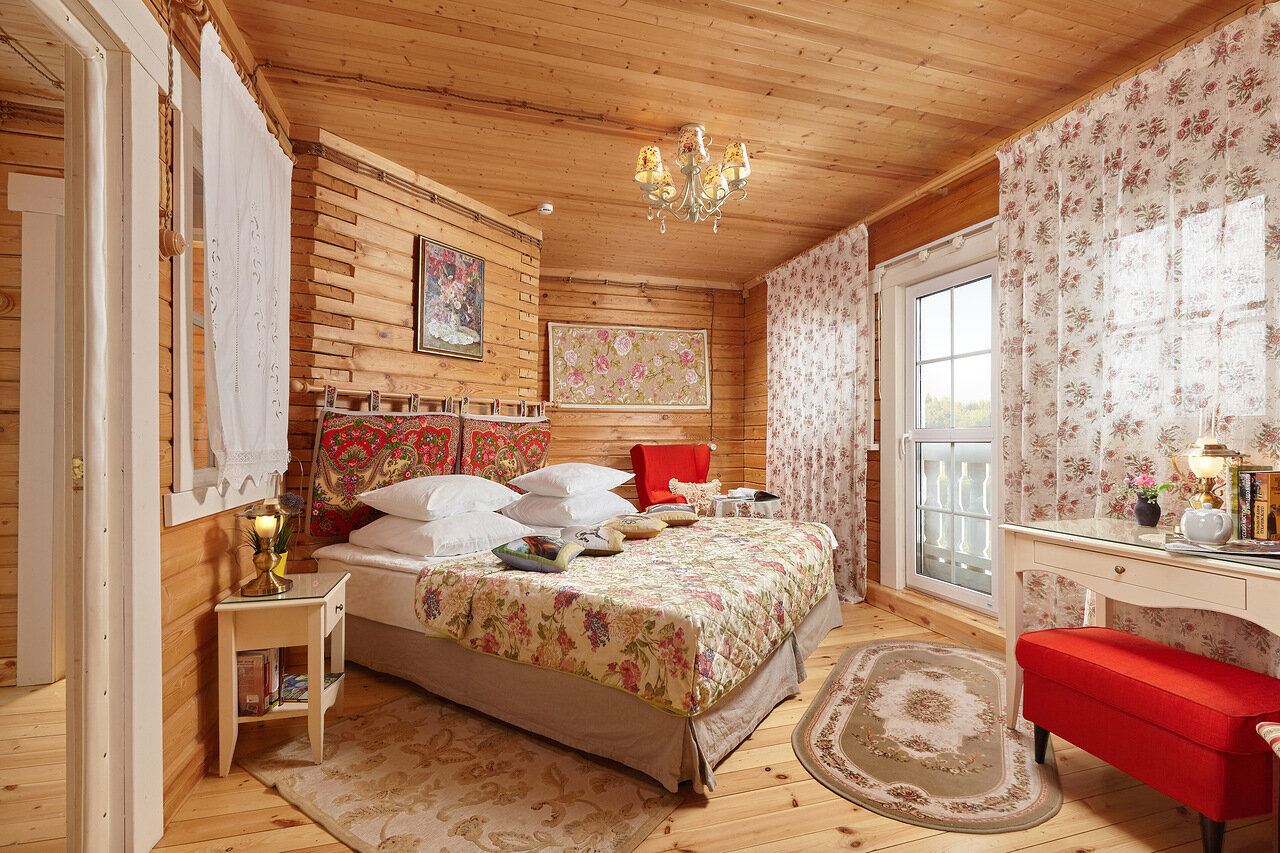 Небольшая гостиница в виде дворянской усадьбы оформлена в русском стиле. В номерах уютно — ковры, картины, старинная мебель. Каждый номер продуман как для пары, так и для семьи с детьми. На территории есть деревянные гостевые домики — хороший вариант для тех, кто хочет уединиться.