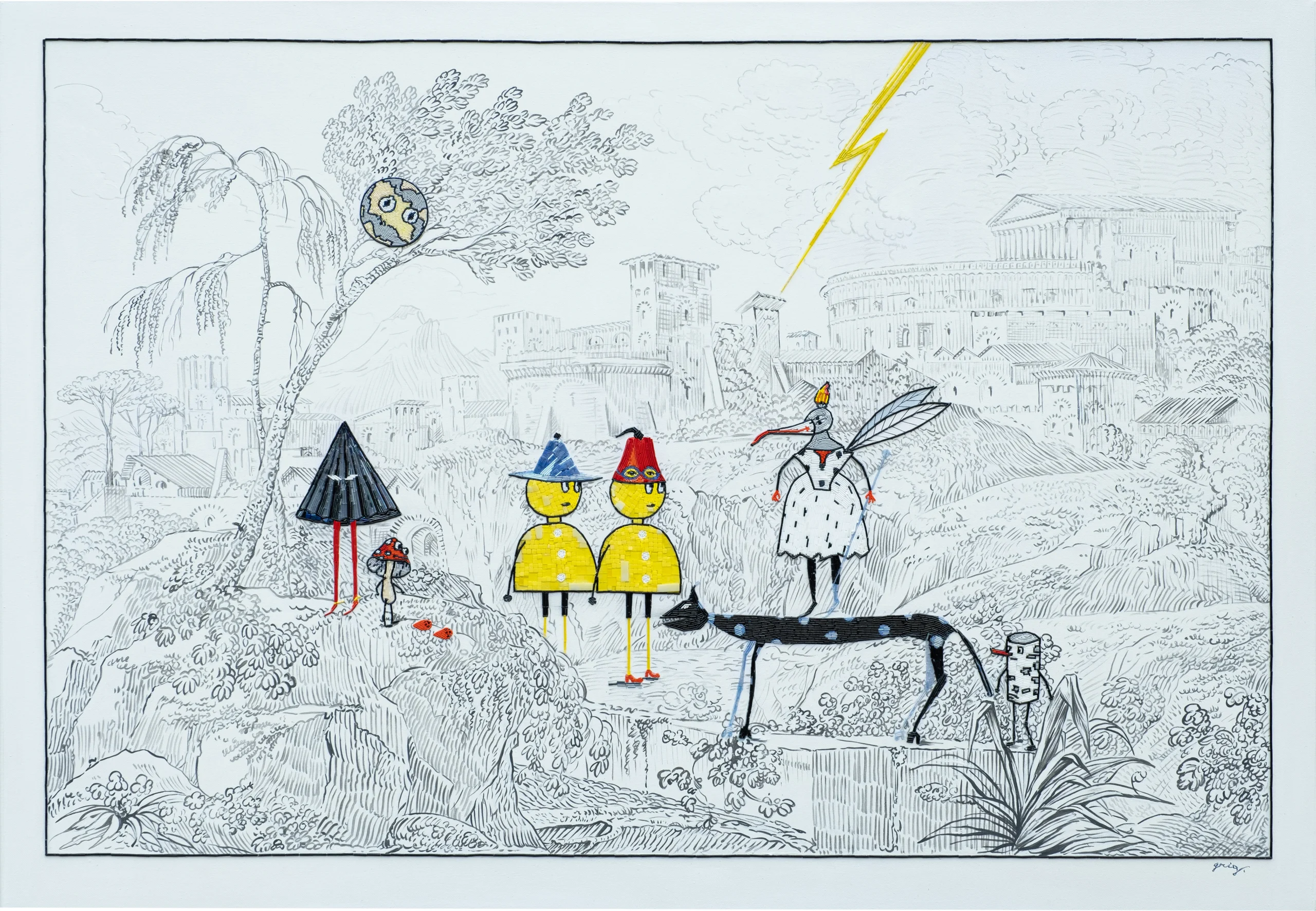 В персональном выставочном проекте Владимира Грига центральное место занимают работы в технике мозаики из стекляруса — сложные, многосоставные произведения, в которых мерцающие нити стекла создают эффект живого, пульсирующего изображения. Этот материал, знакомый человечеству с эпохи античности, любимый и в советском монументальном искусстве, в руках Грига превращается в инструмент постмодернистского высказывания.