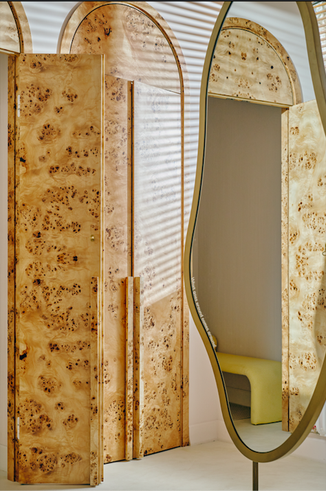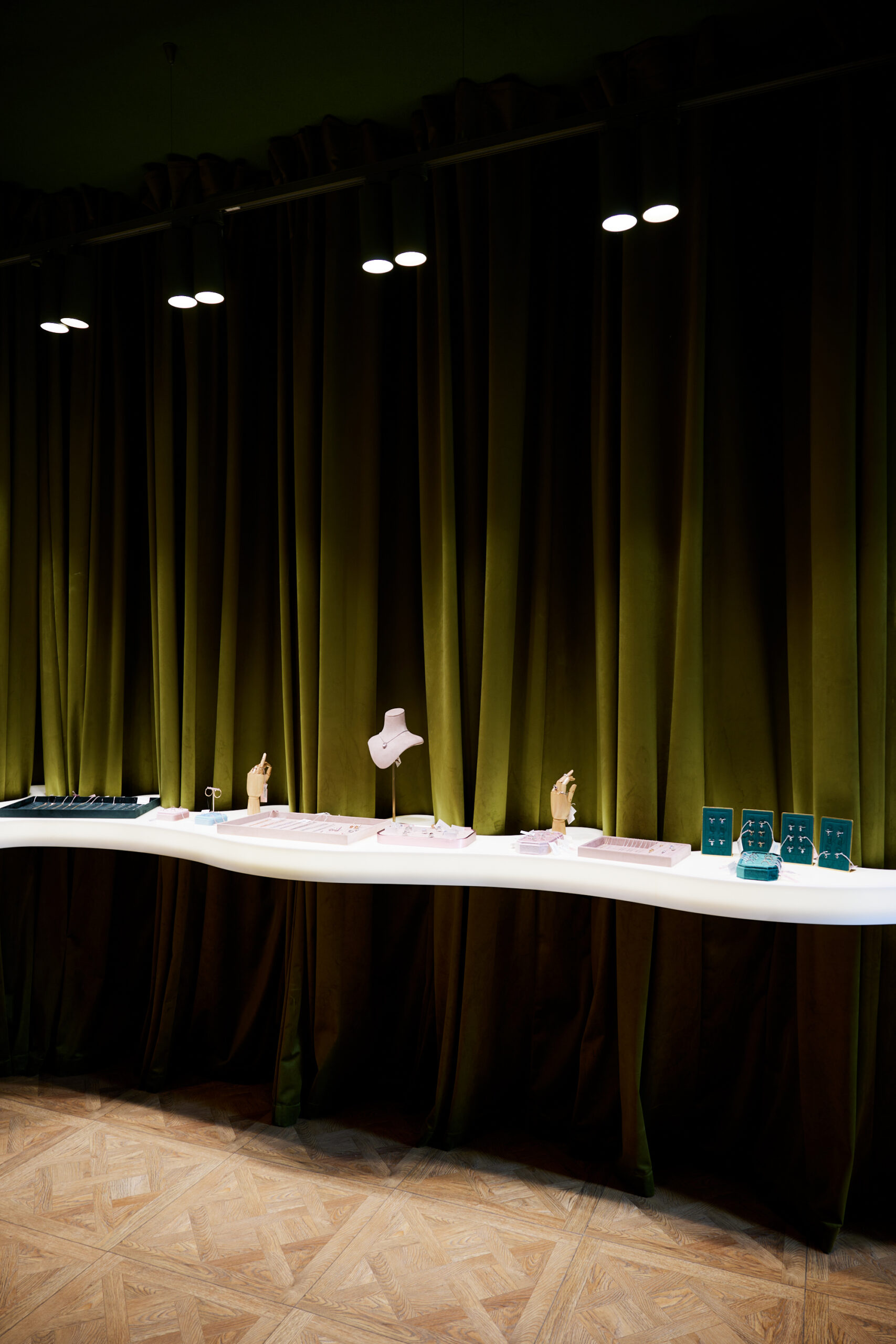 С целью строительства нового дома для бренда его основательница привлекла дизайнера интерьера Екатерину Рыбалко, приложившую руку к таким пространствам, как Present&Simple, Babochka, Around и Seven Lab. Отправной точкой в дизайне стали старинные ювелирные шкатулки – обитые бархатом, украшенные камнями, с потайными выдвижными ярусами. Стены задрапировали бархатной тканью, создав особую атмосферу: всяк зашедший сам почувствует себя оказавшимся внутри шкатулки с драгоценностями. А витрины-волны, выполненные из светопроницаемого искусственного камня, подчеркивают каждый камень, подсвечивая его со всех сторон и наделяя украшение магнетическими свойствами.
