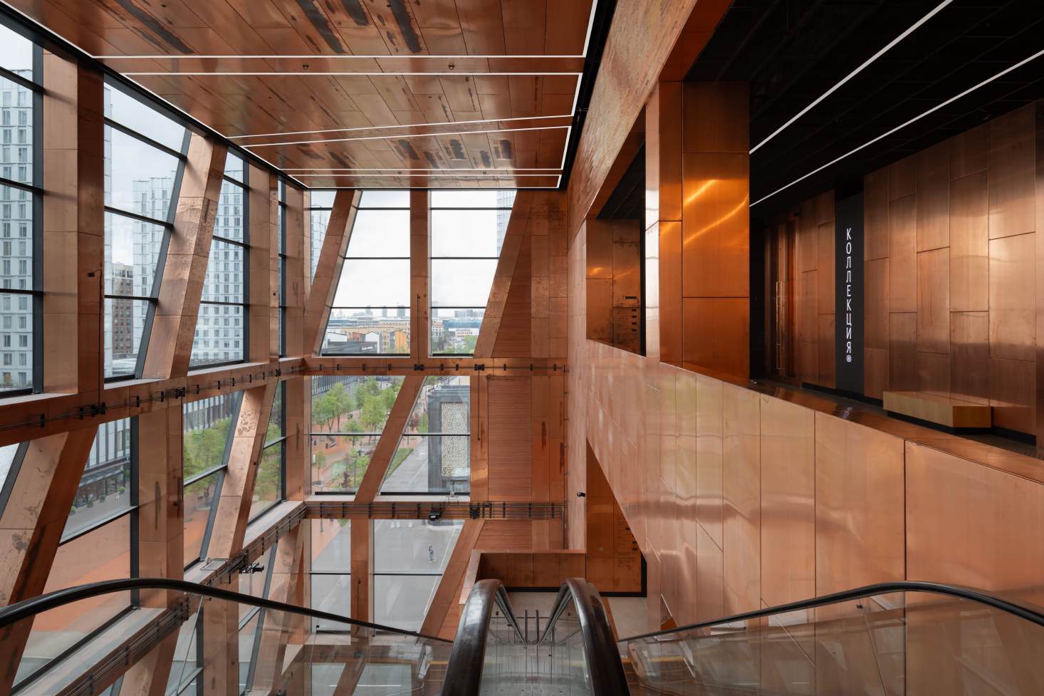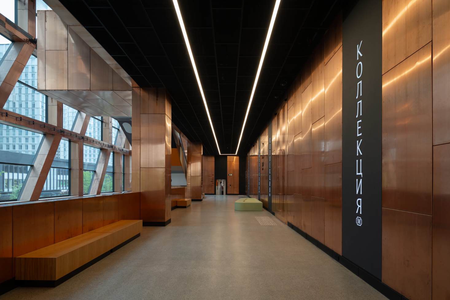 На первом этаже пространства расположились билетные кассы, гардероб, конференц-зал, концепт-стор, детская комната и ресторан, выше — выставочные залы с потолками 5-7 метров и частыми источниками света. Попасть в них можно через плавно открывающиеся автоматические медные двери.