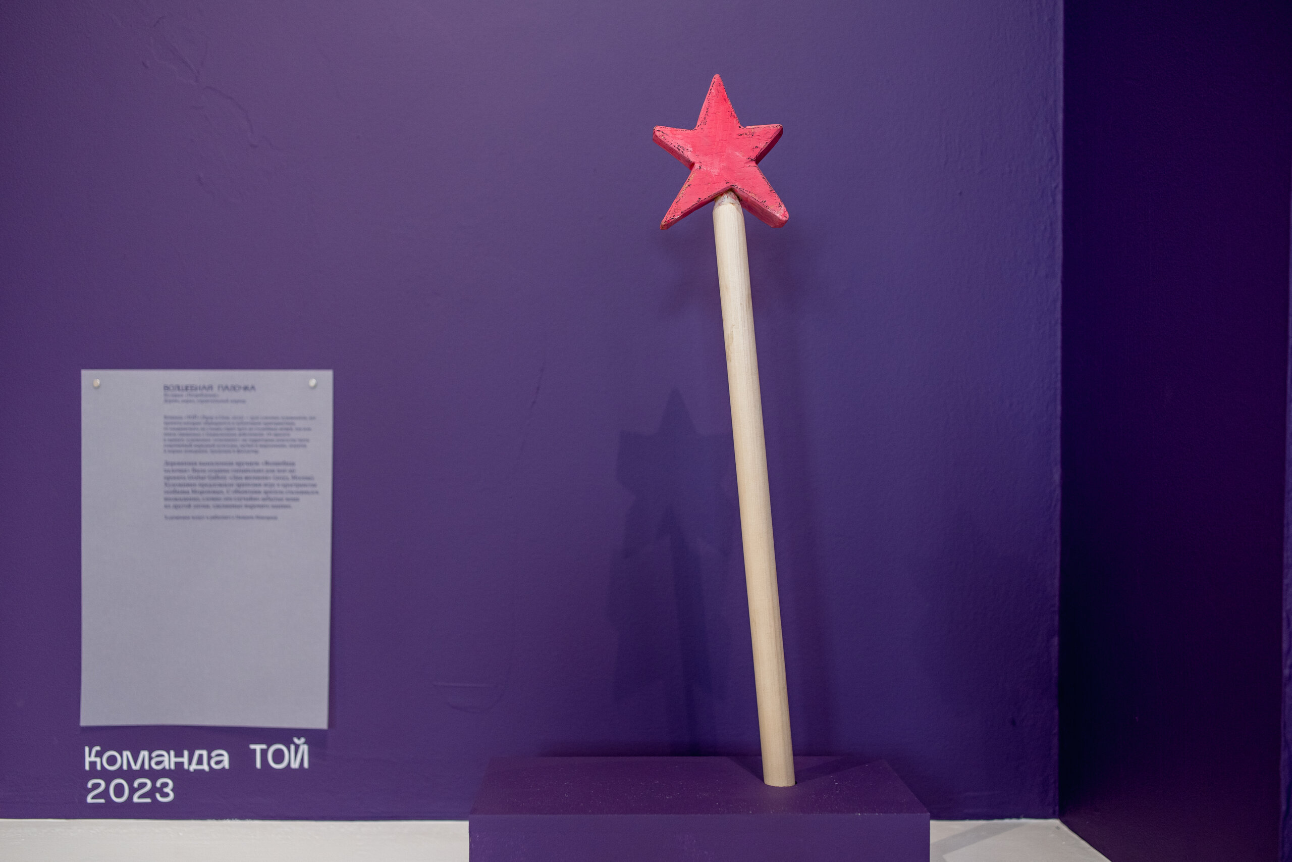 Текстильные панно Тимура Новикова, Людмилы Барониной и Ульяны Подкорытовой задают тактильную и визуальную ритмику, придавая выставке дополнительное измерение. Не менее важны и объекты — например, керамическое зеркало Родиона Китаева и ранние работы Команды «ТОЙ».