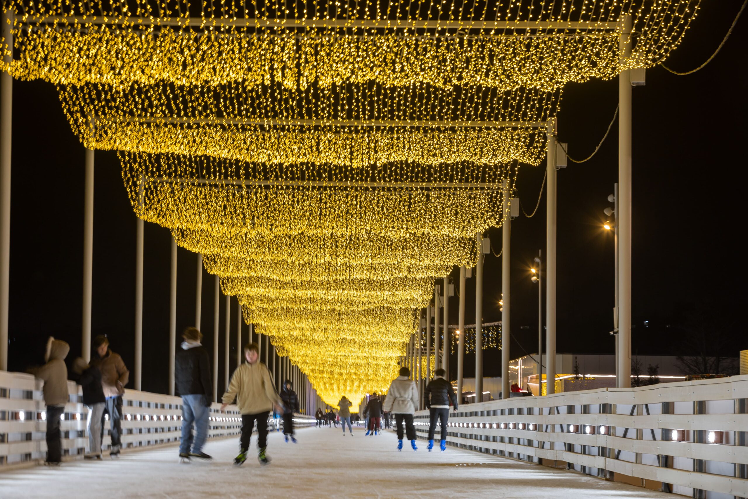 Новый каток на Царской набережной — один из самых длинных линейных катков в России протяженностью 1,7 км. Только представьте: мчаться на коньках под сиянием гирлянд, создающих эффект звездного неба, по ледовой трассе идеального покрытия. Территория возле катка украшена елочными шариками, арочным тоннелем и новогодними фотозонами. На Причальной площади расположены лаунж-зона, большая елка и теплые павильоны. Входная группа не заставит долго стоять в очереди, ведь инфраструктура продумана для комфорта гостей: всего открыто 12 турникетов. А добраться до катка можно на специальном новогоднем поезде, который отправляется от метро «Кленовый бульвар».