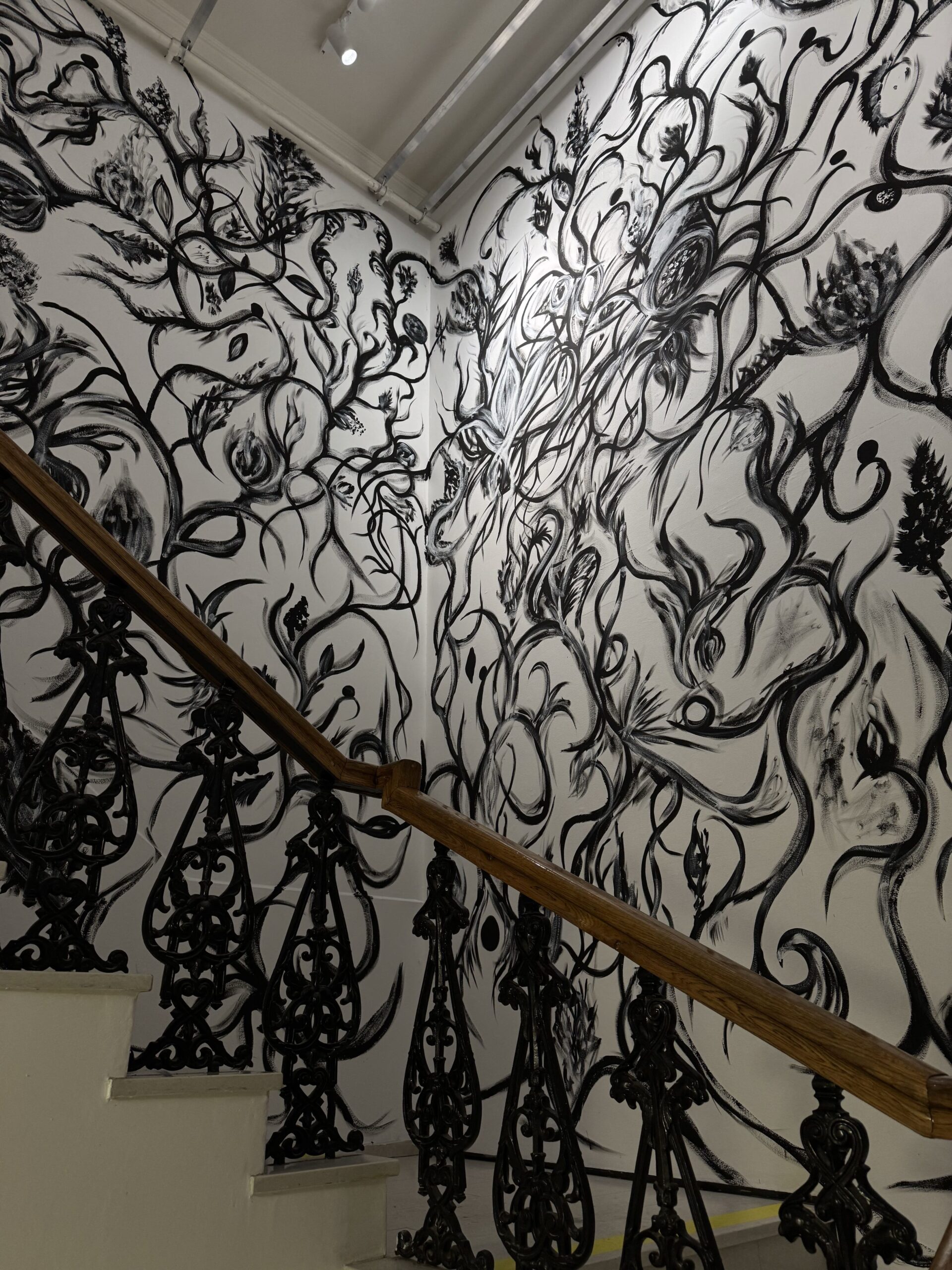 Черный — синоним классики и элегантности. Именно этот цвет художник использовал, когда создавал инсталляцию прямо на белоснежных стенах лестничного портала с коваными перилами, привлекая внимание зрителя и намекая, что на втором этаже пространства есть еще на что посмотреть. Например, на новые картины «Из пустоты» и полиптих «Мечты». Их основа — черный, который помогает проявиться вкраплениям золота или ярким букетам из розового, красного, синего, зеленого.