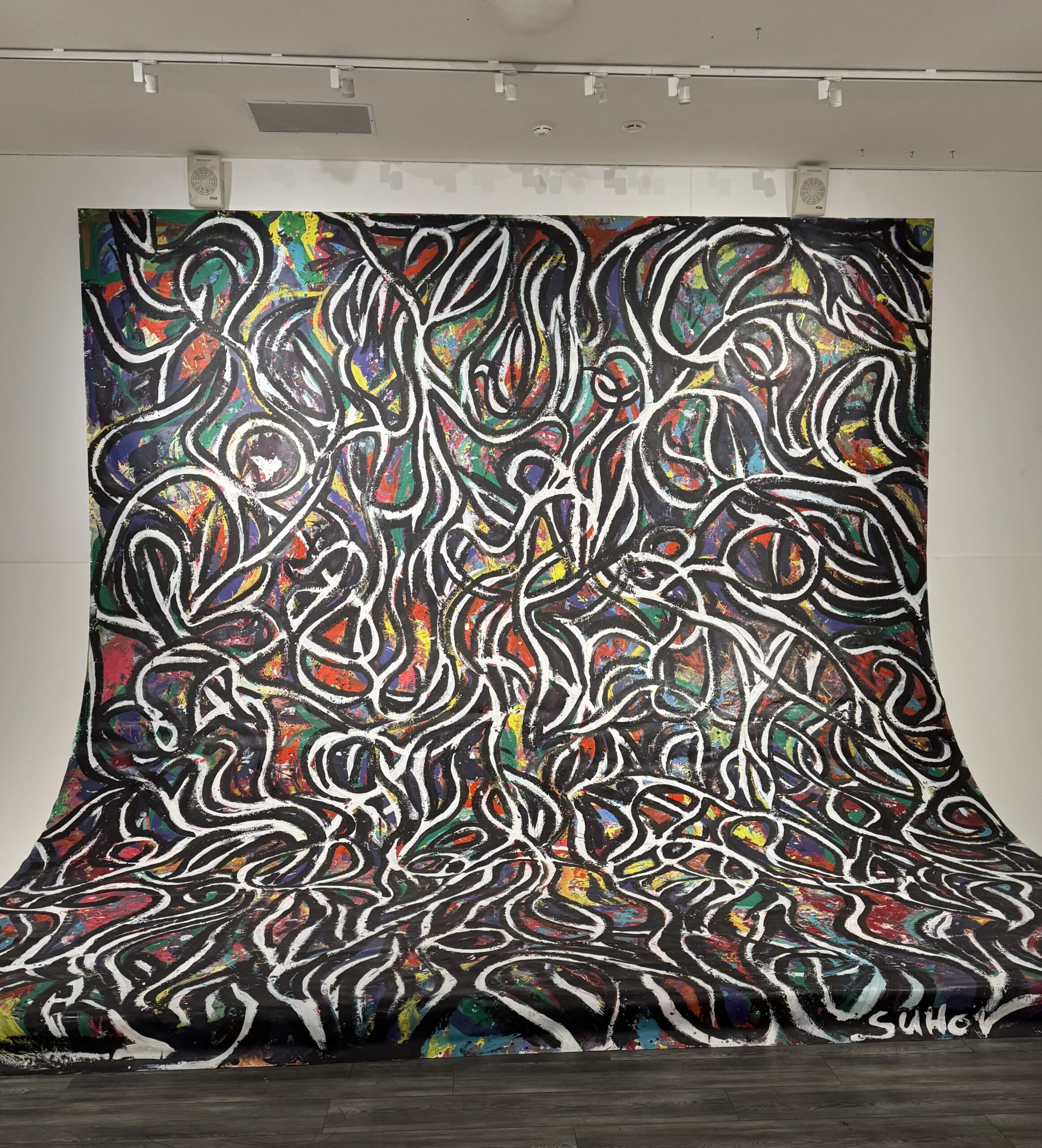 Большой размер холстов впечатляет, но только до тех пор, пока вы не заглянете в соседний зал, целую стену которого занимает разноцветная баннерная ткань. Вот тогда-то зрители и понимают, что такое настоящий масштаб. Огромное полотно появилось 1 июня 2024-го в результате перформанса, где детям разрешали взять краски и оставить на холсте любой след. Никакого техзадания и эскиза — только выражение искренних эмоций, иными словами — креатив чистого разума. Именно такое название и получила работа — «Чистый разум». В ее реализации приняли участие 50 ребят. Теперь же она превратила площадку ММОМА в настоящую фотостудию с необычной циклорамой. Так что, если ищете, где сделать яркий кадр, — вы знаете, куда идти.