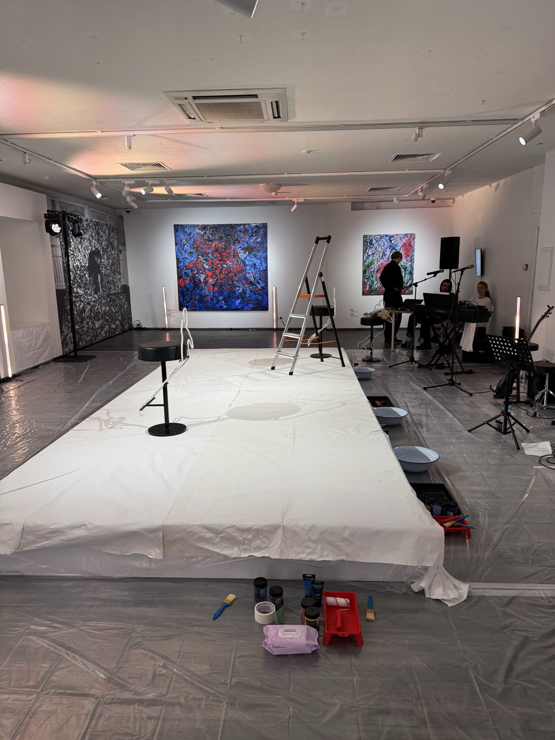 Примерно по такой же схеме, как был создан «Чистый разум», прямо сейчас в музее выстраивается свежая абстракция. На этот раз на помощь творцу пришли актеры в белых костюмах из «Покровка.Театр». В день открытия труппа показала отрывок пьесы Владимира Малягина «В тишине». В качестве сцены артисты использовали плотный слой бумаги. На нем они не только рассказывали историю, но еще и оставляли отпечатки окрашенных рук, ног и всего тела. И хотя «В тишине» — спектакль о трудных 1990-х, краски на холсте и одежде придали перформансу живость и дали надежду на лучшее. Чистый белый лист — символ новой жизни, а яркие следы — события в ней. Они могут приносить нам как радость, так и печаль, но именно они формируют целостную картину.