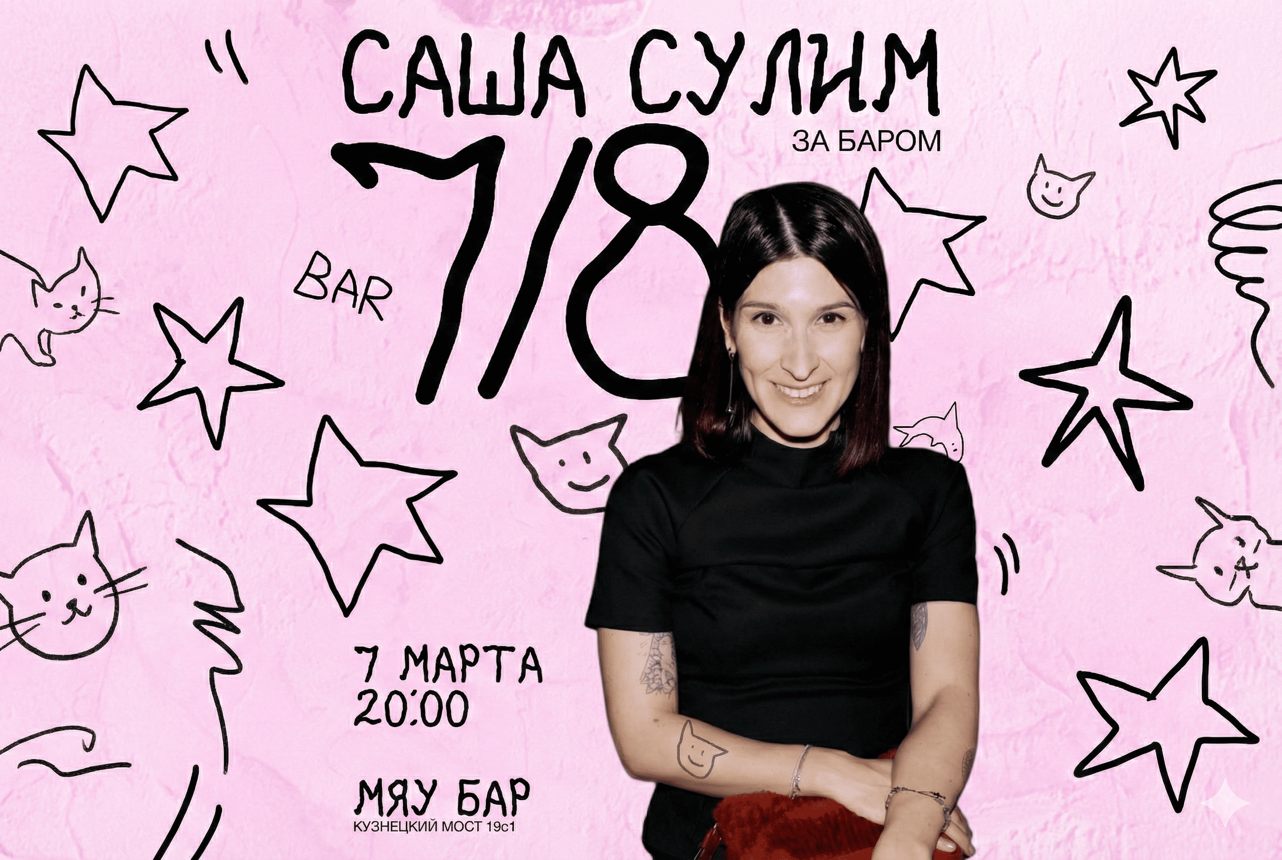 7 марта — гест с Сашей Сулим. В этот вечер за барной стойкой окажется человек не из барной индустрии, а из мира историй и тру-крайма. Спешл-меню задумано как знакомство — он состоит из фрагментов жизни Саши: университетских лет, любимого кино и разных городов.