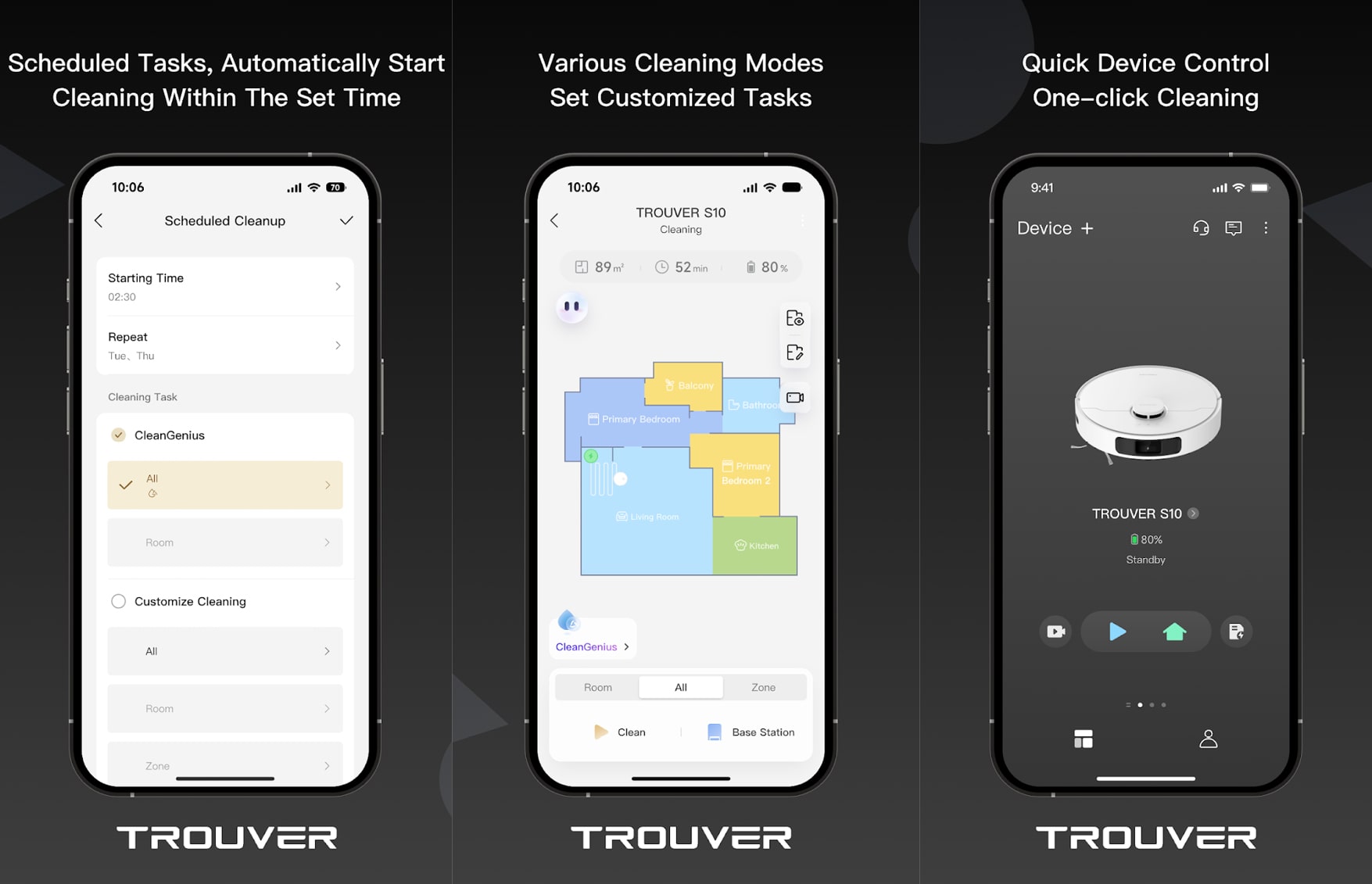 Фирменное приложение TROUVER встречает простым и понятным интерфейсом, рассчитанным на тех, кто раньше не пользовался роботами-пылесосами. Основные функции — запуск уборки, выбор режима, работа с картой помещения и усиление обработки углов или ковров — находятся в одном месте и не требуют долгого изучения.