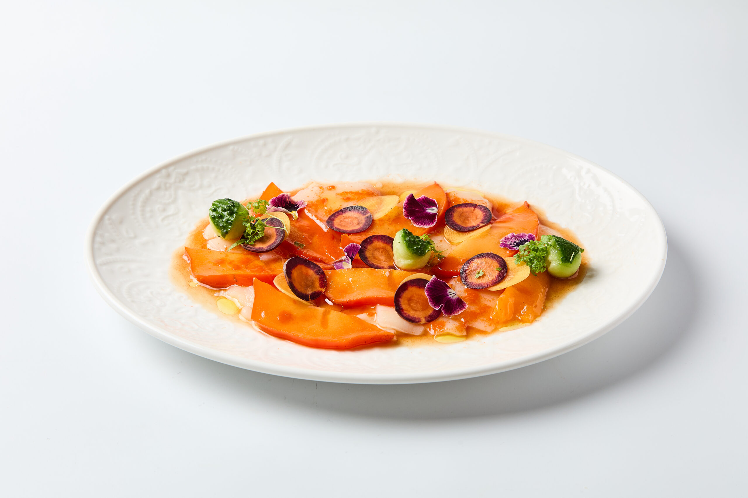 Гребешок нарезать тонкими слайсами, немного посолить, полить морковным медом, оливковым маслом, выложить сверху слайсы хурмы, моркови и огурца, украсить цветами и зеленью.