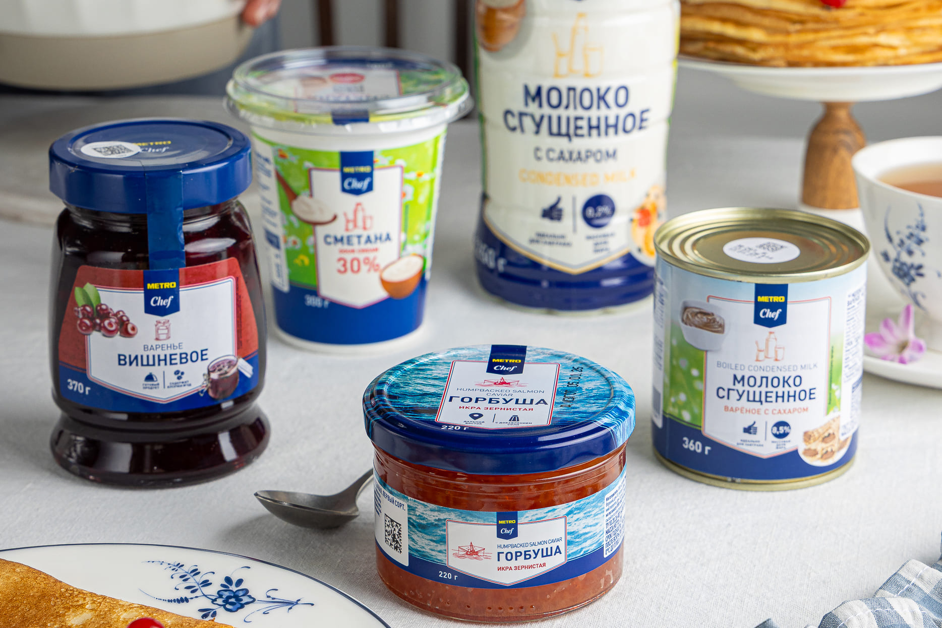В METRO к Масленице всегда полные полки всего необходимого. Обязательно рекомендую присмотреться к фаршу для сытных мясных блинов, творогу высокой жирности и топингам — джемам из линейки METRO Chef».